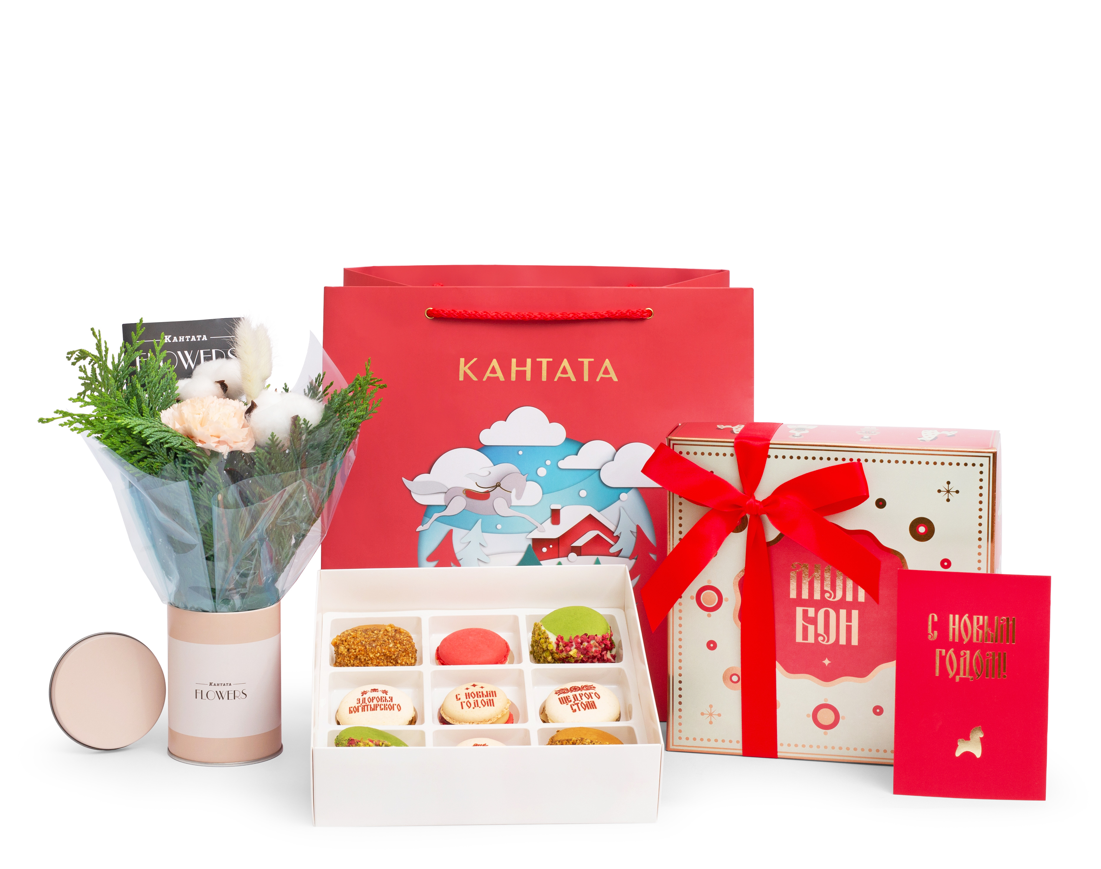 Набор объединяет в себе всё, что мы так любим зимой. Цветы создают атмосферу домашнего тепла, а десертная часть делает момент по-настоящему праздничным.