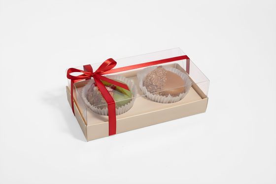 Два пирожных в ПВХ упаковке и бирка с вашим логотипом.