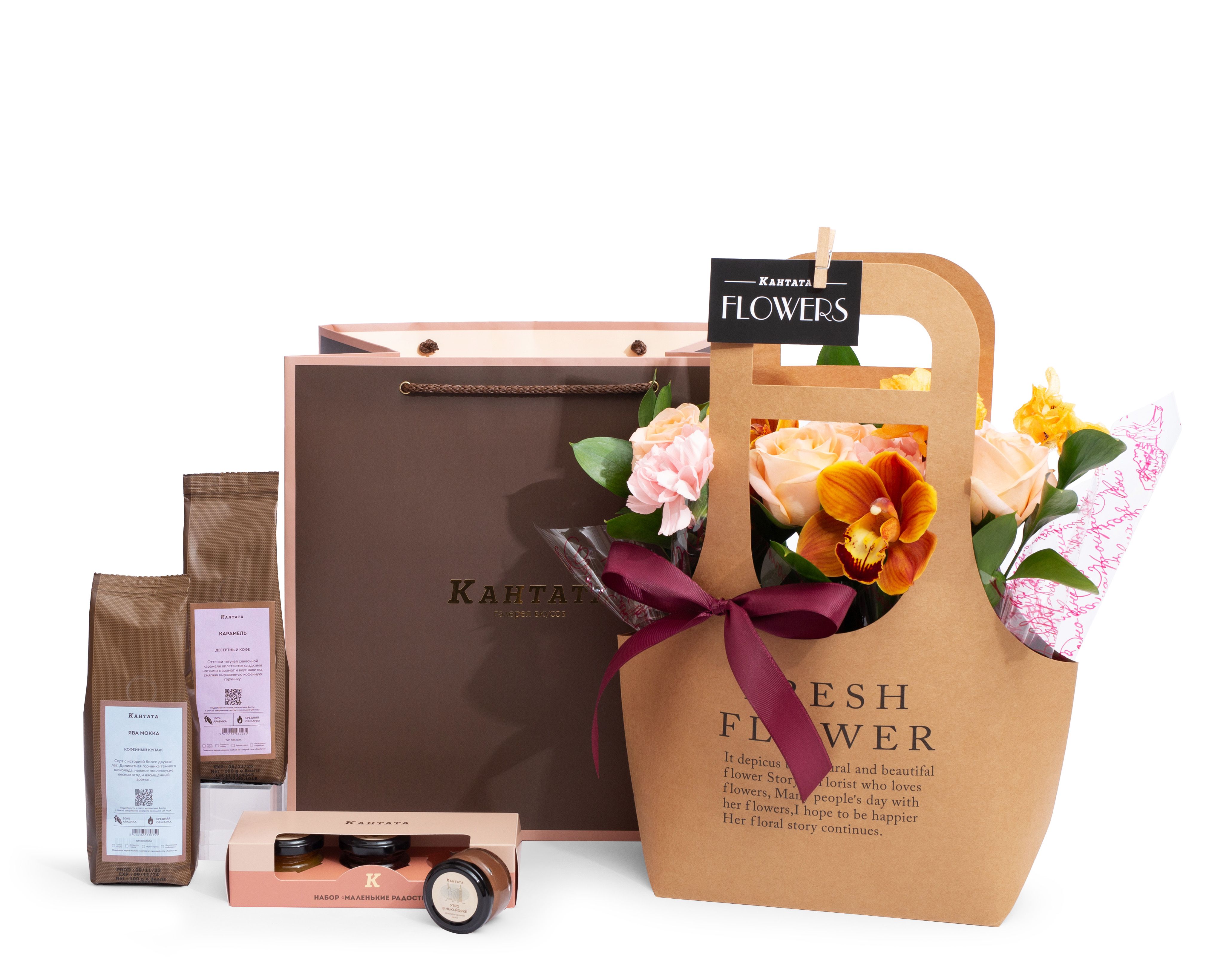 Изящная крафтовая сумочка, внутри которой — настоящий пожар из орхидей, гвоздик и роз! Цветочную композицию мы дополнили двумя бодрящими сортами кофе, классическим и десертным, а к напиткам добавили набор из трех баночек с аппетитными сладостями ручной работы.