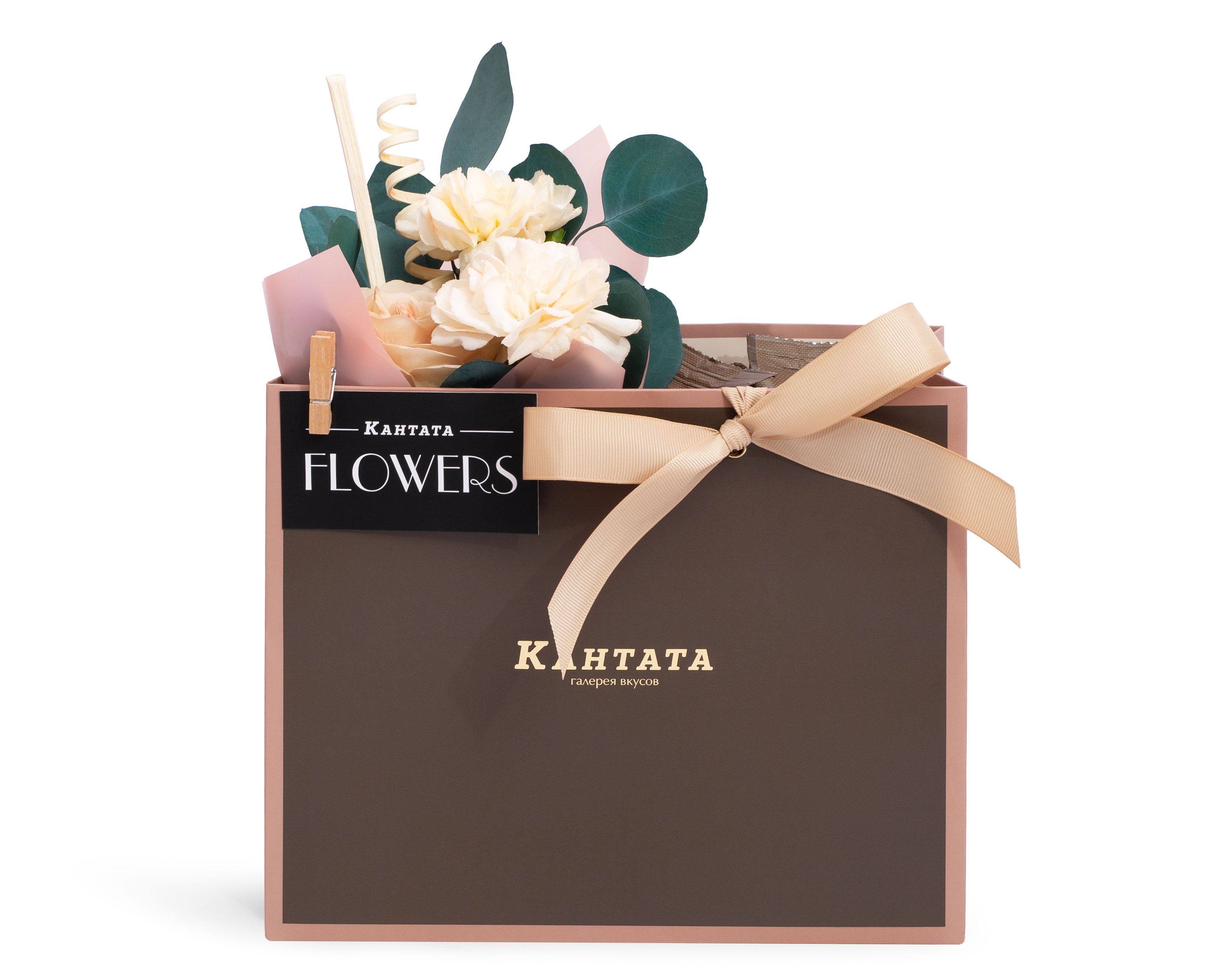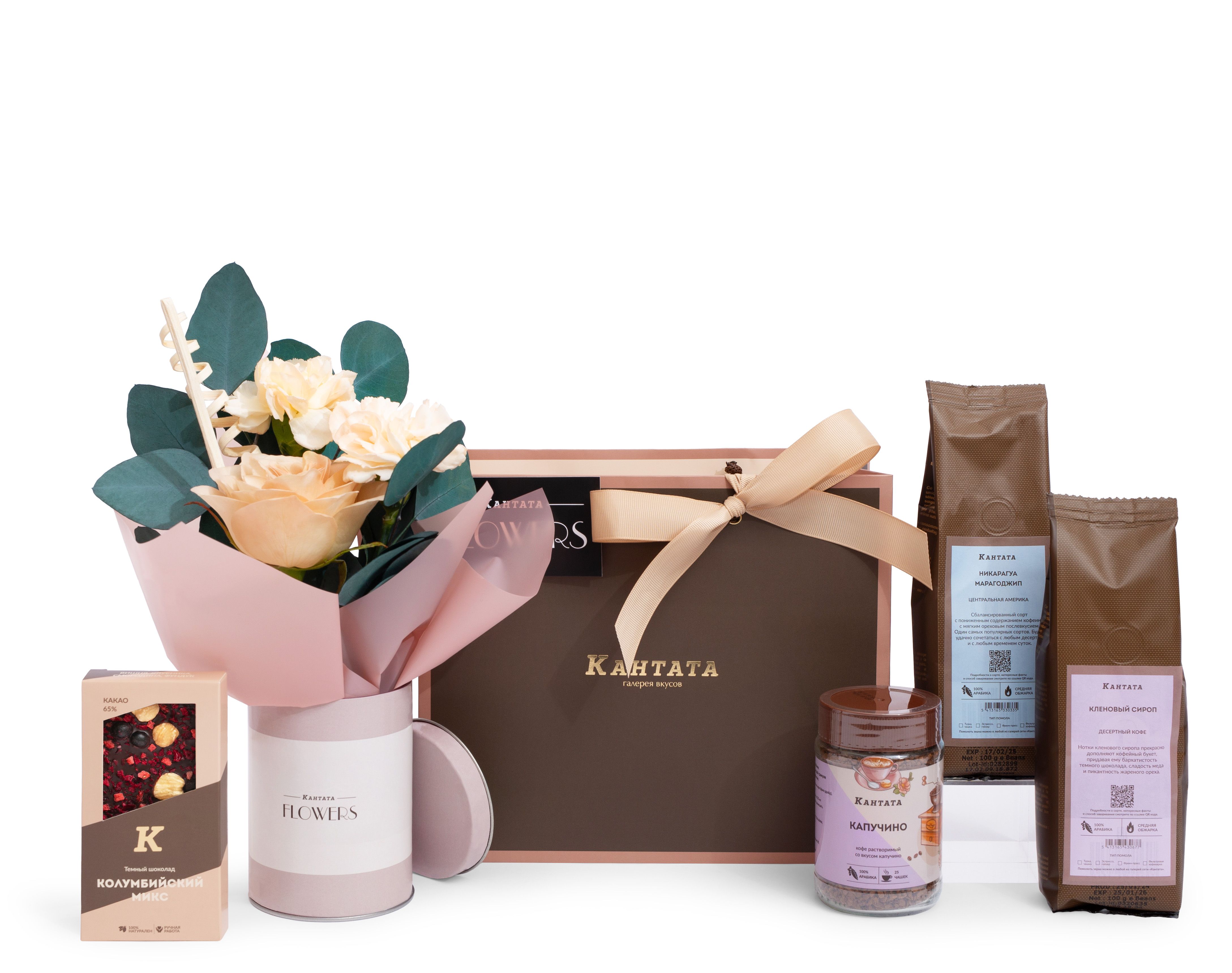 Изящная сумочка, украшенная живыми розами и гвоздиками, скрывает внутри тройку бодрящих кофейных сортов: классический Никарагуа Марагоджип с природным ореховым оттенком и десертный сорт «Кленовый сироп» — в зернах, а также растворимый кофе «Капучино» с бодрящим ароматом и глубоким вкусом. Темный шоколад с орехами и ягодами прекрасно дополнит вкусы кофе.
