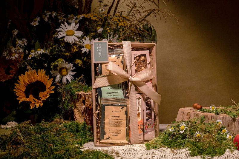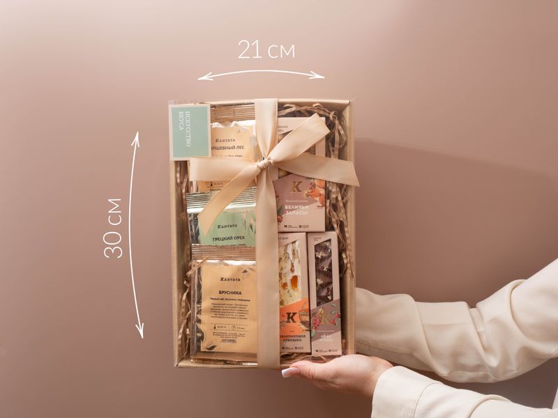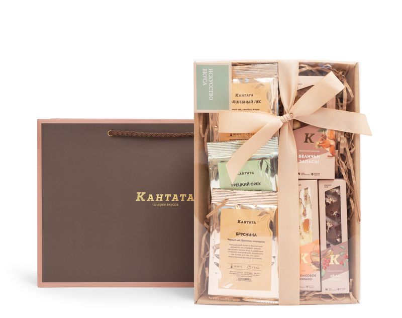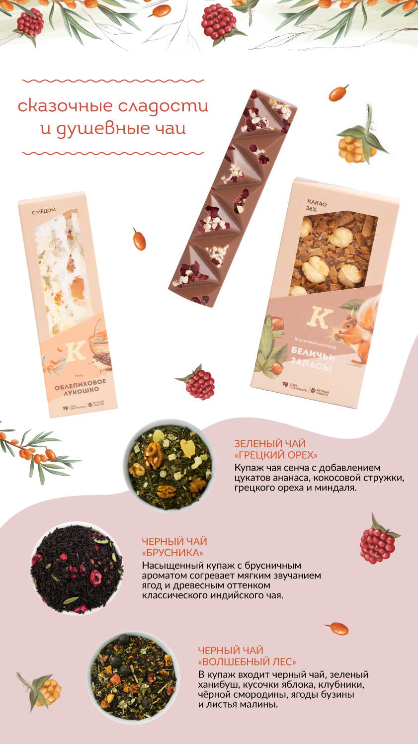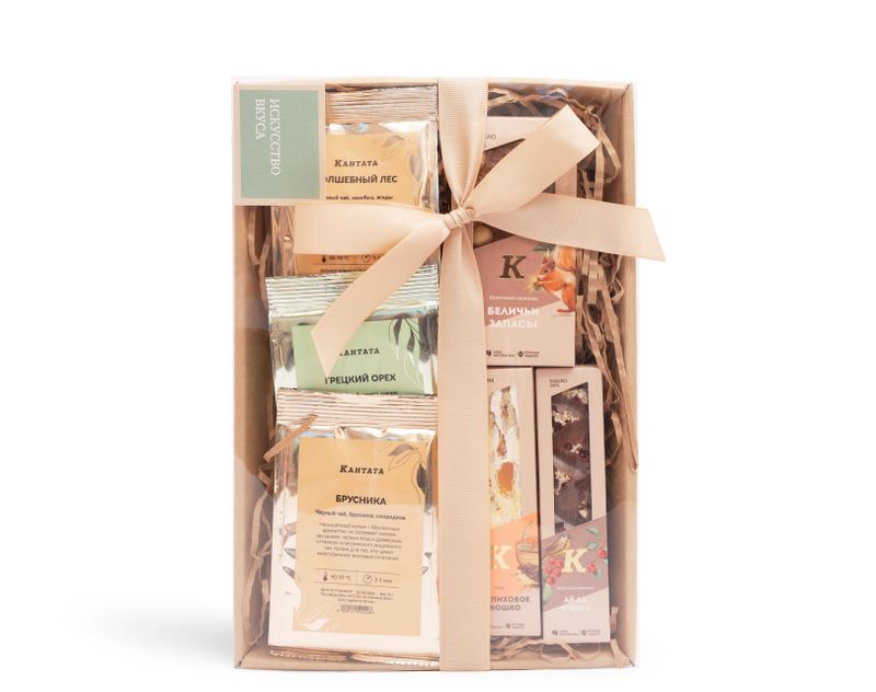 Волшебство — внутри! Чудесный подарок объединяет в себе напитки и сладости, которые навеют воспоминания о любимых сказках детства. Здесь — душистый купаж «Волшебный лес», черный ягодный чай «Брусника» и зеленый чай с орешками «Грецкий орех». Также в подарке мы собрали самые сказочные сладости — плитку шоколада «Беличьи запасы» с фундуком, мини-плитку «Ай да ягодка» и воздушную медовую нугу «Облепиховое лукошко».