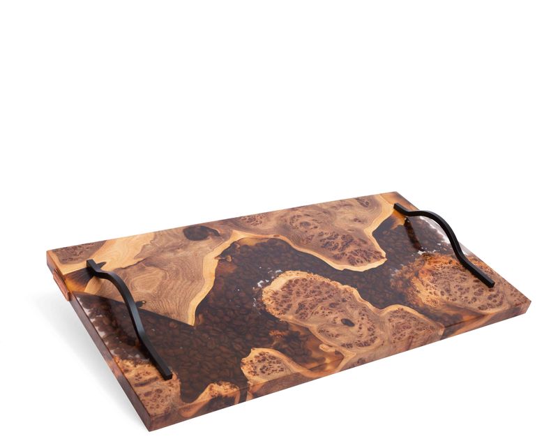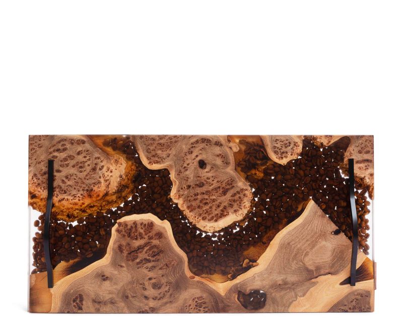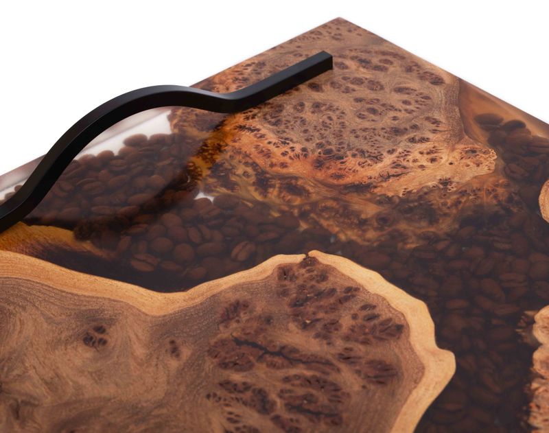 Каждый поднос этой коллекции — не просто предмет, а живая история дерева. Здесь нет повторяющихся линий, симметричных форм или идеальных краёв. Всё наоборот — уникальный кусок древесины сохраняет природные изгибы, рисунки от сучков, линии роста и текстуру, созданную временем. Этот природный сюжет мастера подчеркивают эпоксидной смолой, создавая гладкую поверхность, в которой как в янтаре застыли настоящие кофейные зёрна.