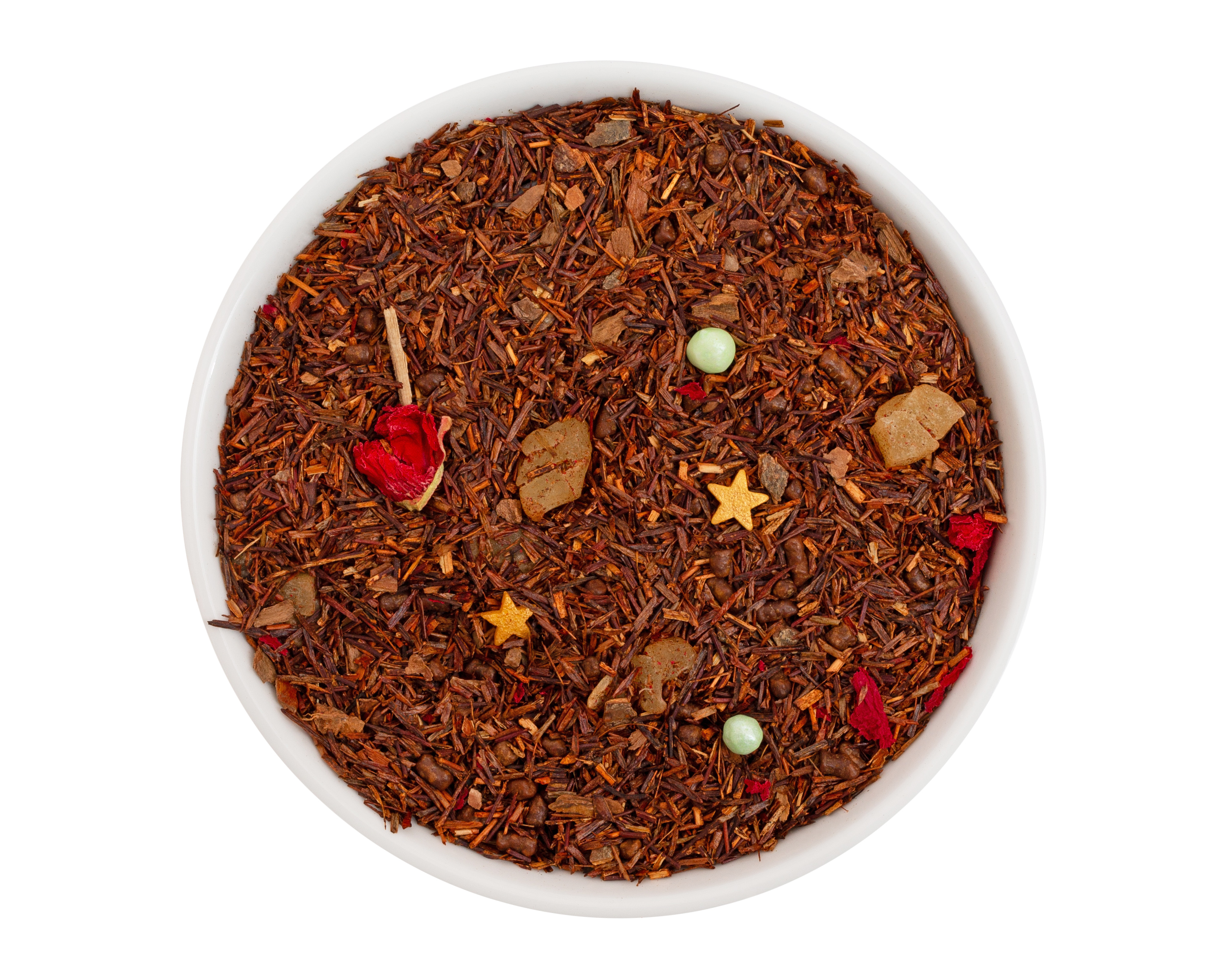 Особое очарование купажу придают красные лепестки граната и праздничный кондитерский декор — они делают его по-настоящему зимним, подарочным и «сказочным». Это идеальный чай для вечерних семейных посиделок, для прогулок с термосом или для уютных домашних ритуалов, когда хочется тепла и спокойствия.