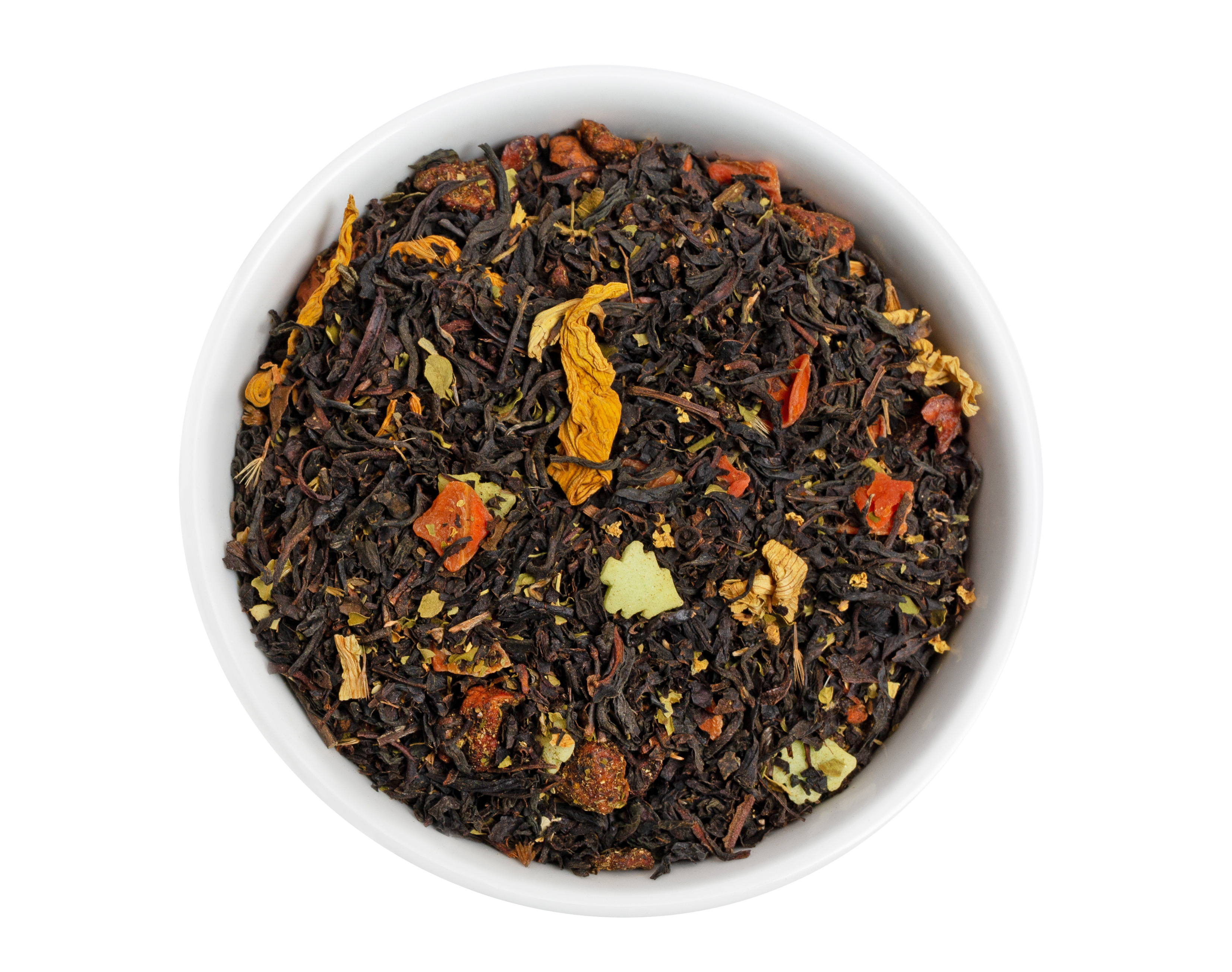 Состав: чёрный чай, кусочки яблока, морковные хлопья, листья моринги, листья стевии, цветы бузины, цветы подсолнечника, кондитерская посыпка - елочки, ароматизатор.