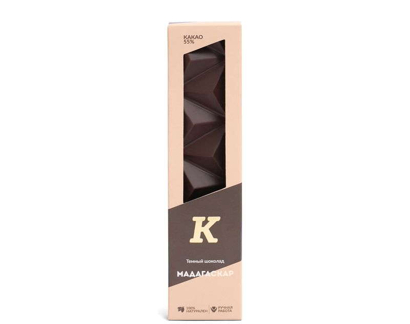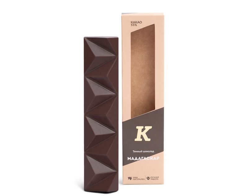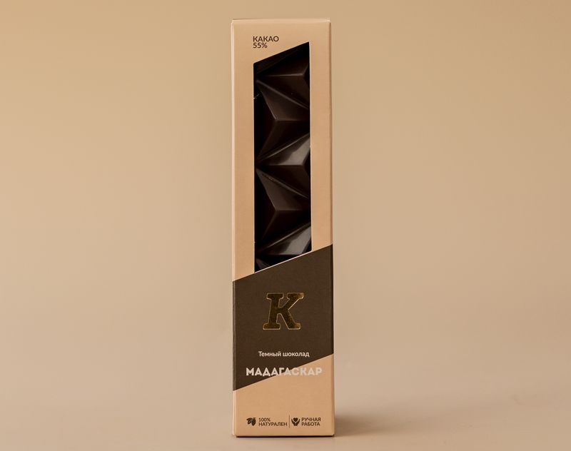 Тёмный шоколад из какао-бобов, выращенных на плантациях Мадагаскара. Обладает насыщенным шоколадным ароматом с нотками табака и черной смородины. Вкус шоколадной плитки насыщенный, с оттенками фруктов, легкой горчинкой и терпкостью ягод можжевельника, послевкусием крепкого черного кофе.