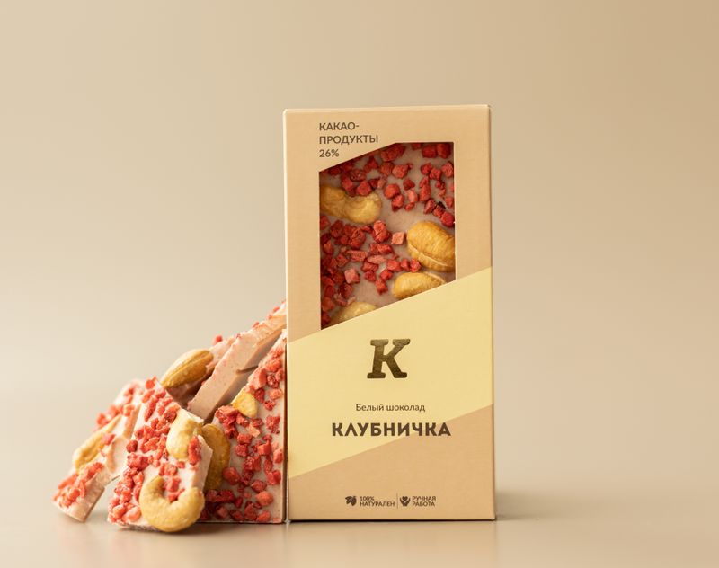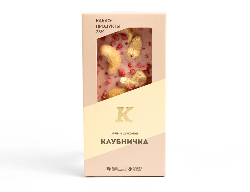 Состав: белый шоколад (сахар, какао-масло, сухое цельное молоко, эмульгатор: соевый лецитин; натуральный ароматизатор: ваниль), клубника сублимированная, орехи кешью. Содержание какао-продуктов — не менее 25,9%. Содержит молоко, сою. Может содержать следы продуктов, вызывающих аллергию.