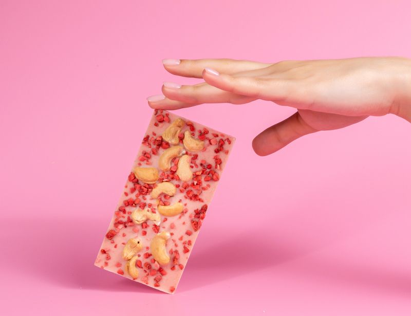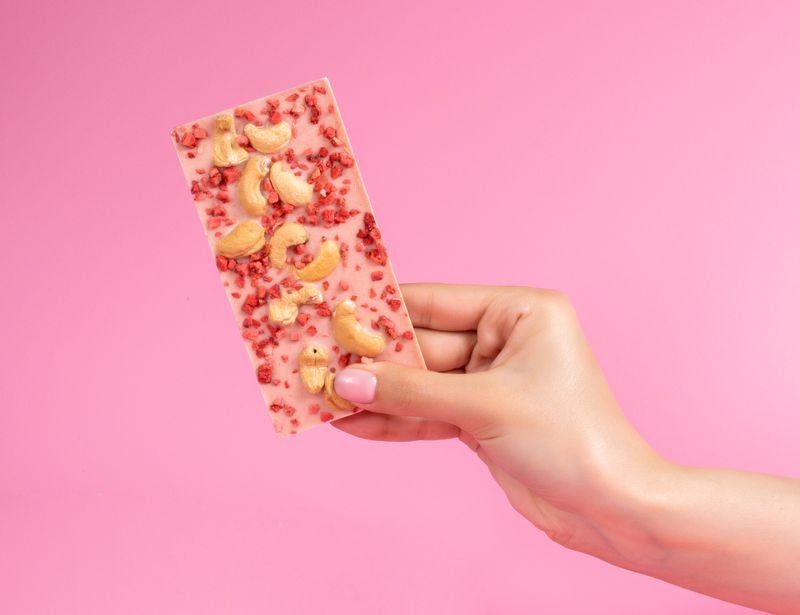 Именно клубника превращает белый шоколад в нежно-розовый. Вкус этой плитки можно сравнить с ягодным мороженым или клубничным йогуртом, в который для пикантности добавили немного хрустящих орешков.