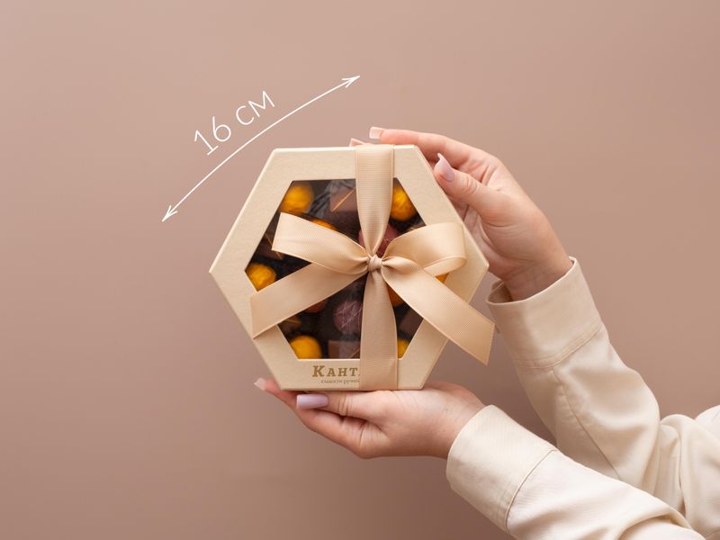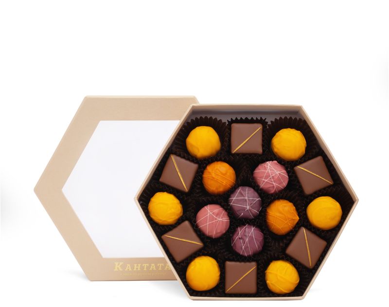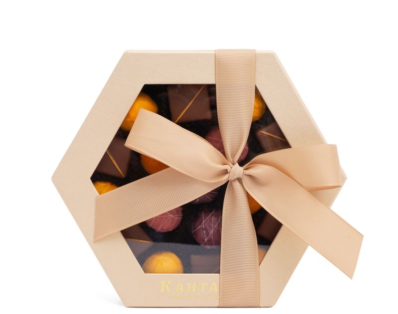Стильный кремовый бокс, внутри которого — конфеты «Аврора» с мягким ореховым пралине из миндаля и фисташки, трюфели «Грана» с обволакивающим сливочным вкусом и ассорти трюфелей «Сырный сомелье» из трех благородных сыров в белом шоколаде.