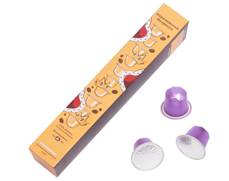 Брутальный, строгий, консервативный. Аромат с яркой кофейной горчинкой. Во вкусе древесные ноты, горький шоколад и фундук. Вкус, застёгнутый на все пуговицы. Капсулы «Эспрессо Королевский» предназначены для приготовления кофе в машинах Nespresso® Original. В наборе 10 капсул.