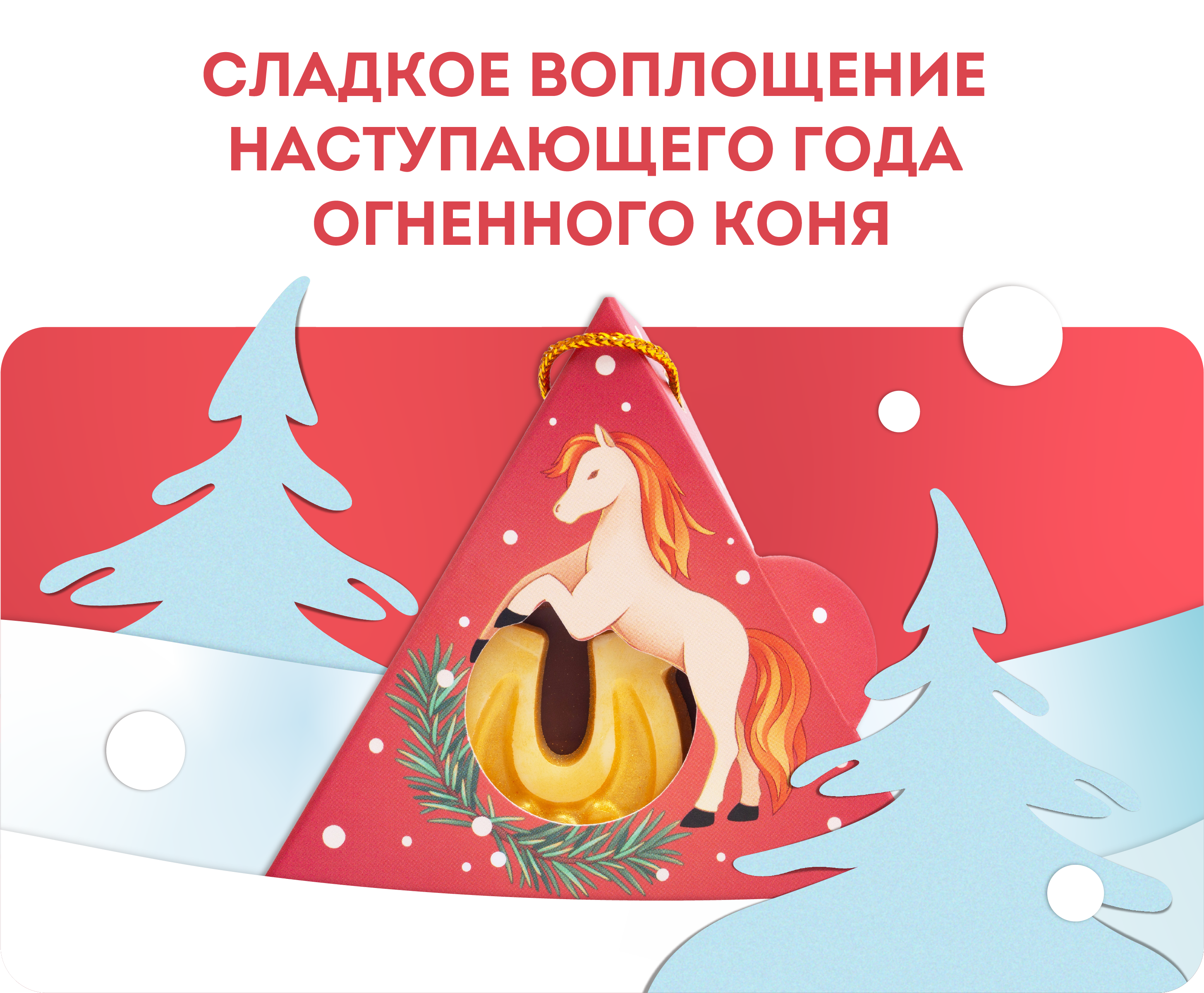 Главный акцент — подкова из белого шоколада, символ удачи и процветания. Она вручную покрыта золотым кандурином, благодаря чему сверкает, словно оберег, принося тепло и радость.