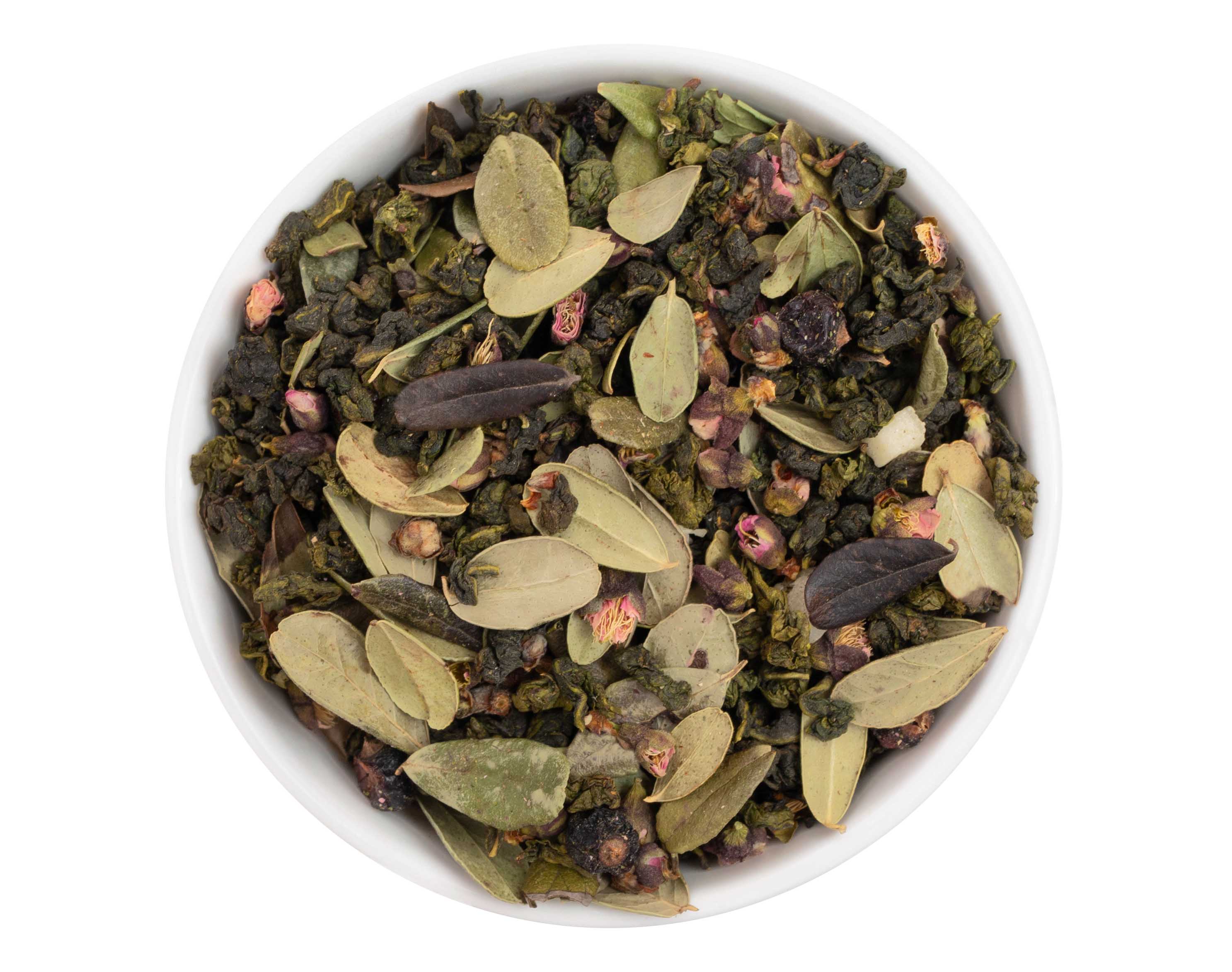 Состав: светлый улун Мао Се, брусника, черная смородина, цукаты ананаса, цветки персика, листья брусники, мята, натуральный ароматизатор.