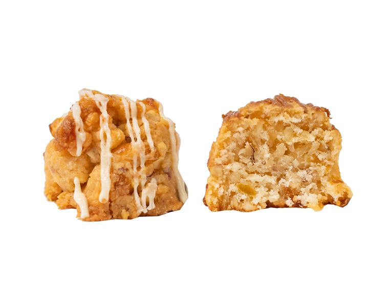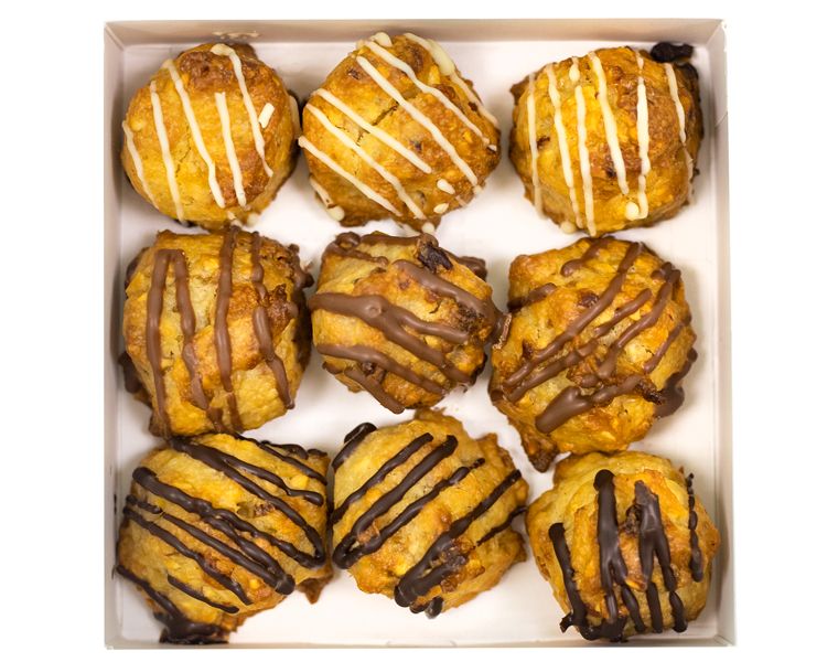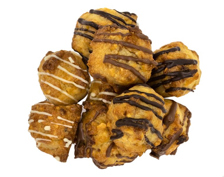 Воздушное и тающее сливочное печенье из дробленого фундука с добавлением цукатов груши и дыни и кокосовой стружки. Украшено тонкими нитями молочного, белого и темного шоколада.
