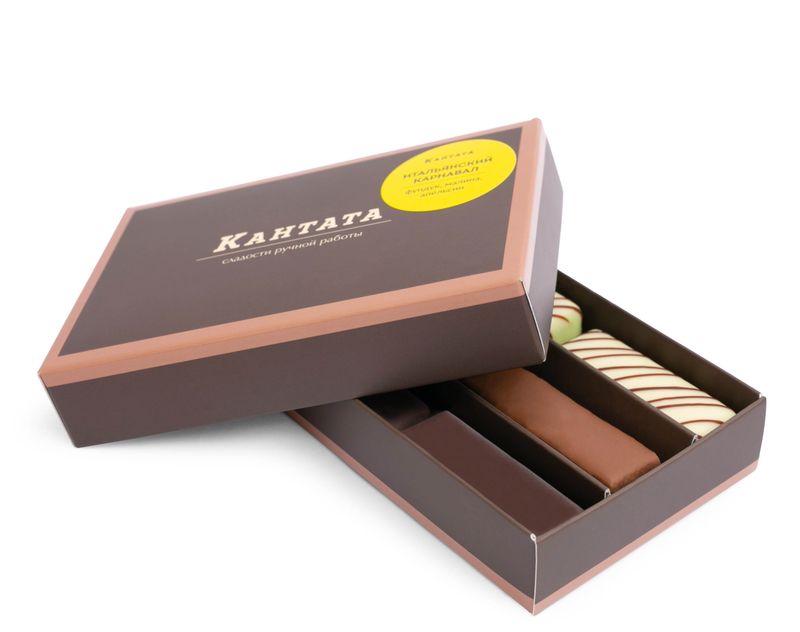 «Джандуйя в​ белом​ шоколаде»: тёмный шоколад (какао тёртое, тростниковый сахар, какао-масло, эмульгатор: соевый лецитин; натуральный ароматизатор: ваниль), ореховая паста из кешью,​ белый​ шоколад (сахар, какао-масло, сухое цельное молоко,​ эмульгатор:​ соевый лецитин; натуральный ароматизатор: ваниль), приправа с ароматом апельсина (декстроза, натуральный ароматизатор «Апельсин», куркума, кардамон, корица, подсолнечное масло, антиокислитель: насыщенные экстракты токоферолов; краситель: экстракт паприки).