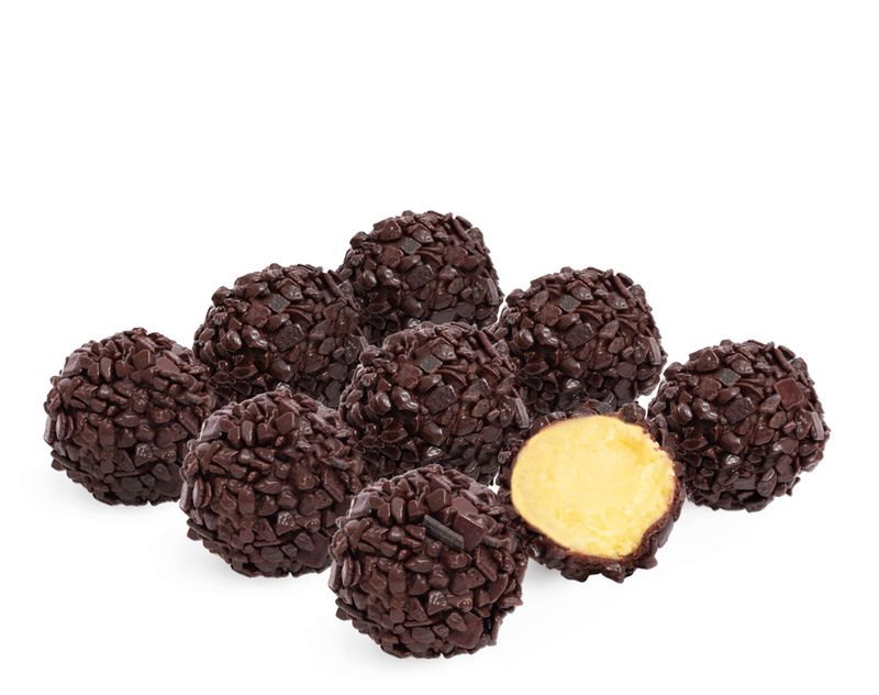 Трюфель с добавлением пюре манго и маракуйи. Сочная фруктовая начинка покрыта темным шоколадом.