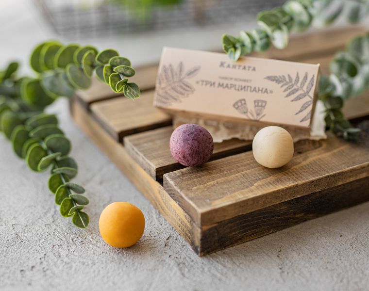 Ларец с тремя видами марципана в виде вкусных разноцветных шаров: классическим, апельсиновым и вишневым.