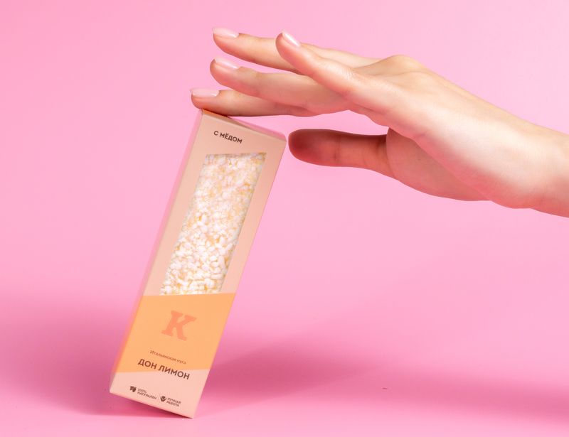 Состав: мед цветочный, сахар, сироп глюкозы, сухой яичный белок, миндаль жареный цельный, цукаты лимона (лимонная корка, глюкозно-фруктозный сироп, сахар, регулятор кислотности: лимонная кислота; консервант: диоксид серы), белый шоколад (сахар, какао-масло, сухое цельное молоко, эмульгатор: соевый лецитин; натуральный ароматизатор: ваниль), кондитерская крошка из белковой массы (сахар, пшеничный крахмал, яичный белок), рисовые шарики (мука рисовая, мука пшеничная хлебопекарная, сахар, соль), вода, картофельный крахмал, вафельная бумага (картофельный крахмал, вода), лимонная приправа (декстроза, масло лимона и другие натуральные ароматизаторы, куркума, натуральный ароматизатор «Имбирь»).