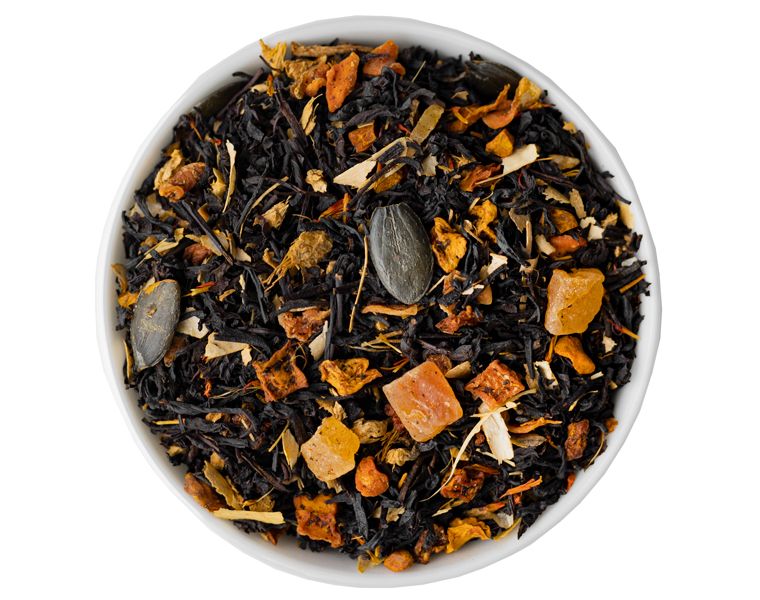 Состав: черный чай, тыква, морковь, папайя, имбирь, ароматизатор, куркума, тыквенные семечки, корочки бобовых, корица, сафлор.