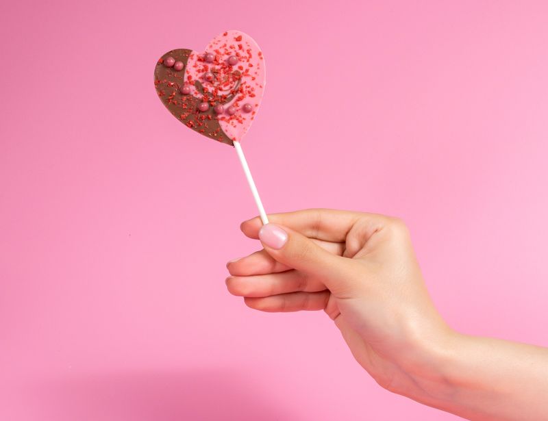 Фигурный шоколад в виде сердца на палочке. Сладкий танец молочного и клубничного шоколада в вихре хрустящих шариков и сочных ягод.
