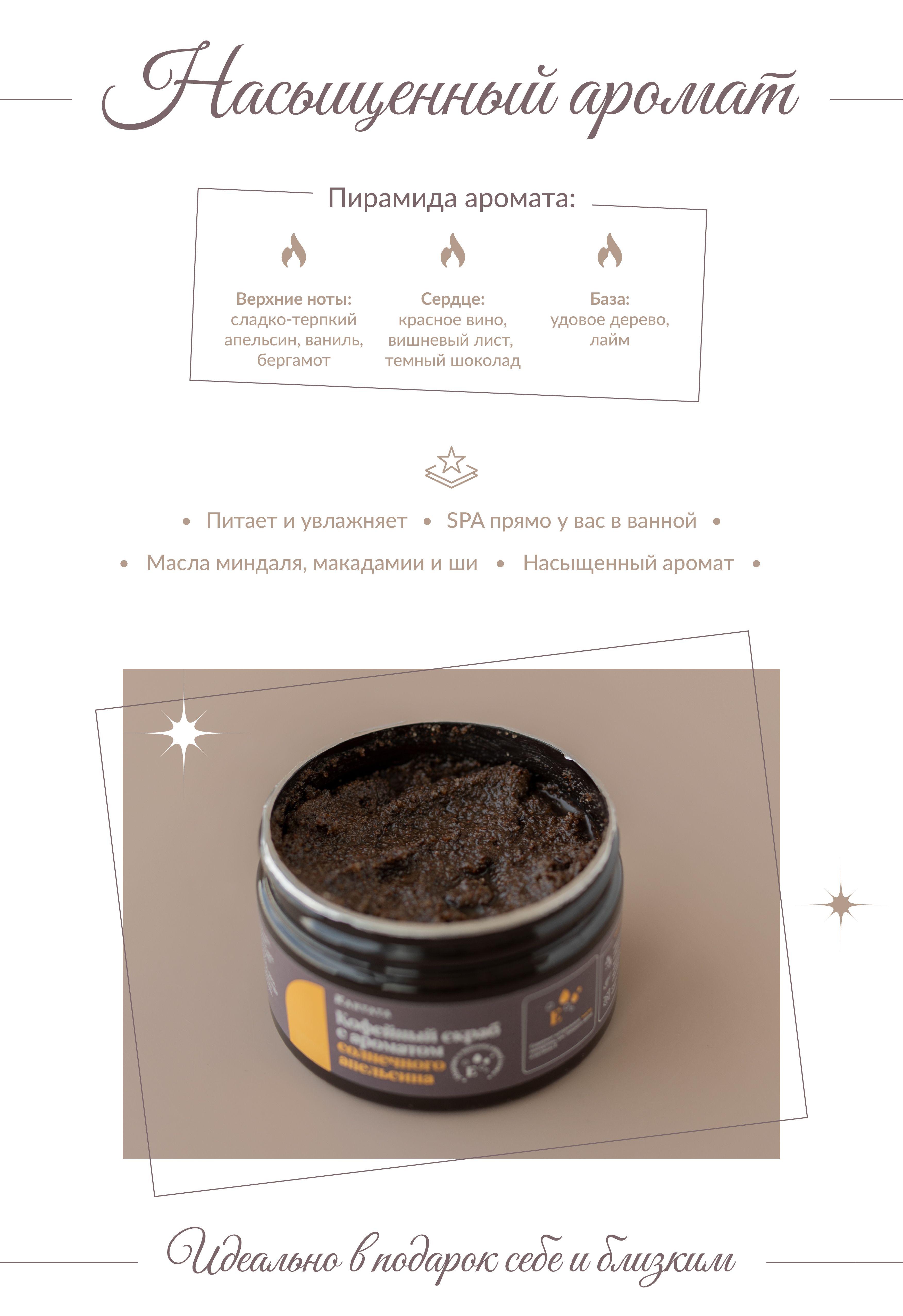 Кофейный скраб для тела с ароматом солнечного апельсина вдохновит на что-то прекрасное! Он не только эффективно очищает кожу, но и дарит неповторимый цитрусовый аромат, который пробуждает самые тонкие чувства.