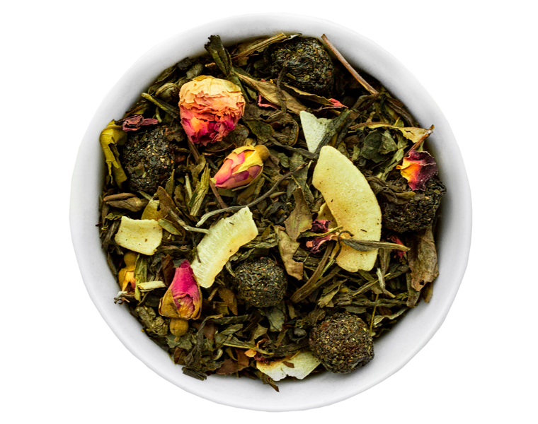 Состав: купаж китайского белого чая Бай Му Дань и зеленого чая: Дарджилинг, Лу Шань Юнь У, Лун Цзин, Жемчужина дракона, сублимированная вишня, кокосовые чипсы, бутоны роз.