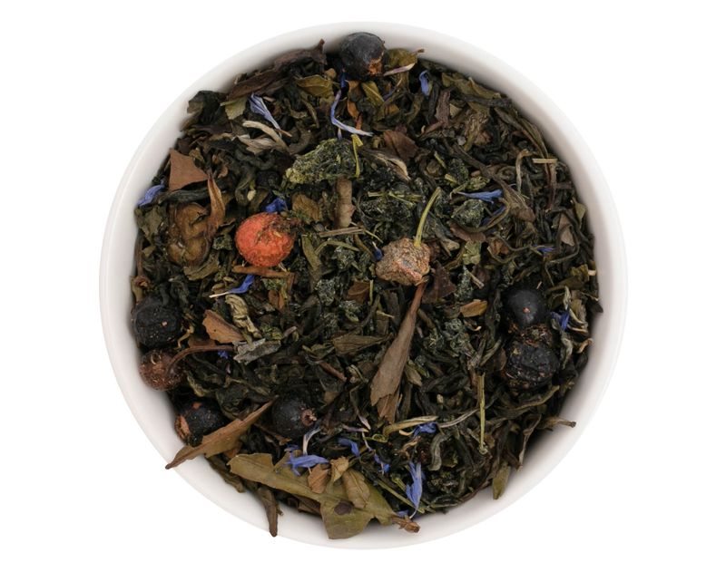 Купаж, в котором белый и зеленый чай работают над созданием напитка здоровья и красоты. Помогают им в этом жасмин, красная и черная смородина, василек, абрикос и гиностемма.