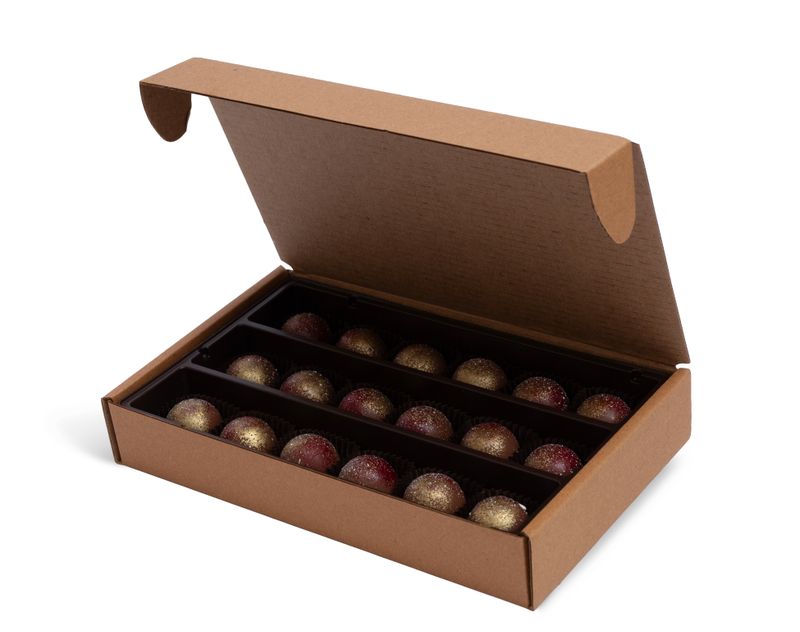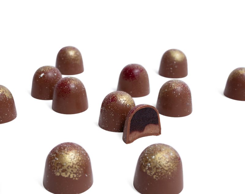 Каждая конфета декорируется вручную: красный акцент напоминает винную ноту начинки, белый — снежный покров, а золотой — магию праздничного вечера.