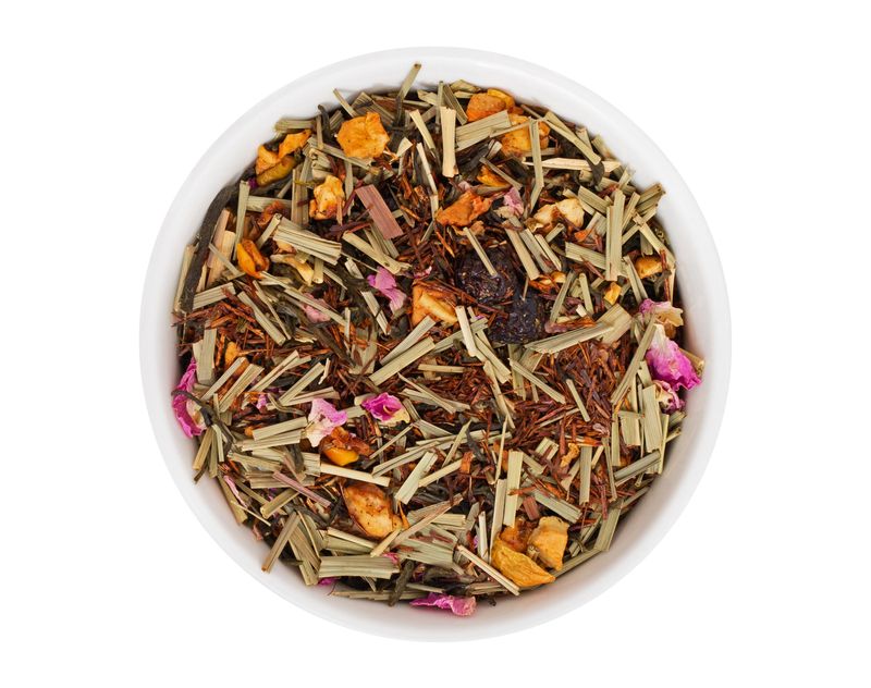 Состав: зелёный чай, лемонграсс, ройбос, яблоко сушеное, вишня сушеная, лепестки розы, ароматизатор, ароматизатор натуральный.
