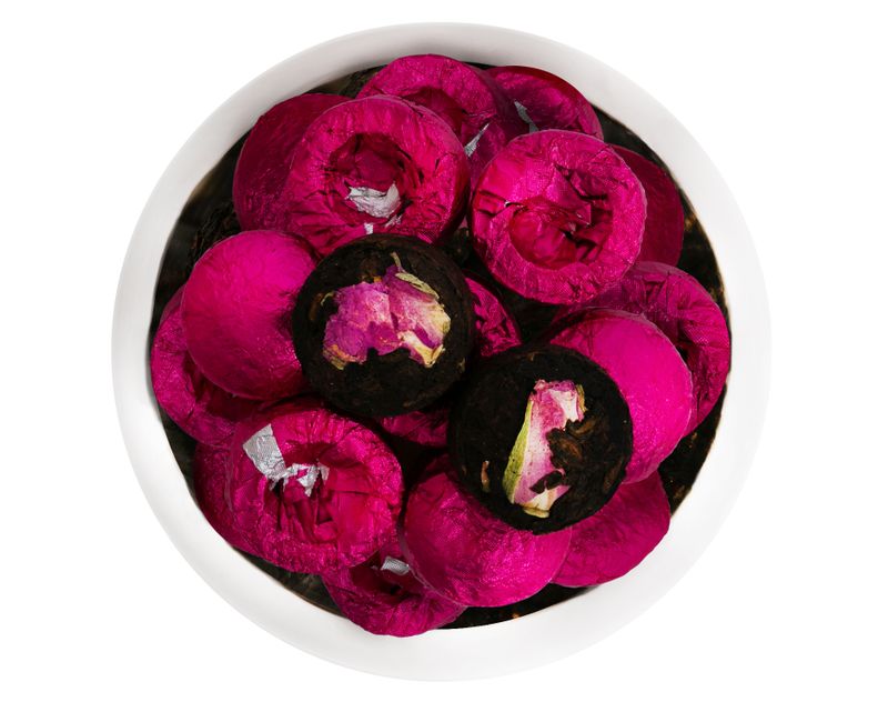 Молодой классический шу пуэр двухлетней выдержки из провинции Юньнань, уезд Мэнхай соединен в плотной чаше прессованного порционного чая с цельными лепестками ароматной розы.