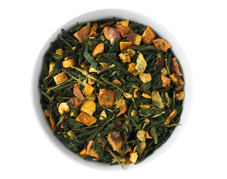 Состав: китайский зелёный чай Сенча, кусочки яблока, имбирь, цедра апельсина, цедра и кусочки лимона, ароматизатор.