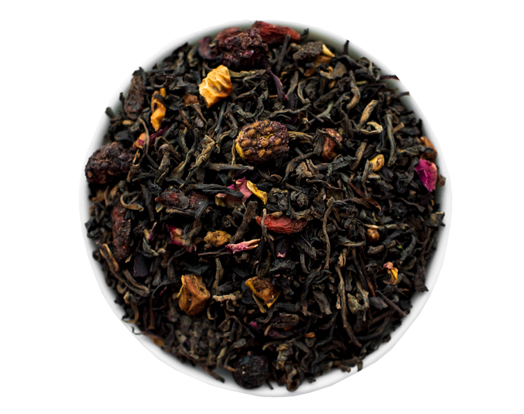 Состав: китайский чёрный чай Пуэр, ароматизатор, яблоко, изюм, ягоды годжи, клубника, ежевика, малина, черная смородина, лепестки розы.