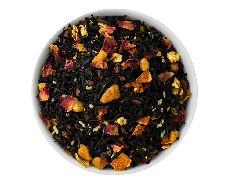 Состав: индийский чёрный чай Ассам, кусочки какао, цедра апельсина, кокосовая стружка, жареный карамелизованный миндаль, ароматизатор, лепестки розы.