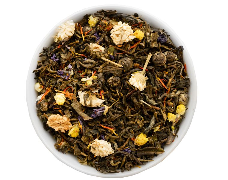 В густой светлой «Тени инжирного дерева» (иначе говоря – смоковницы) можно заметить целый букет: яркие цветы бессмертника, сафлор и мальву. Впрочем, вкус этому чаю, как видно из названия, задаёт инжир. Его кусочки придают настою изящную сладость, жасминовые «жемчужины» оттеняют эту сладость лёгкой цветочной ноткой, а экзотический личи завершает вкус настоя пикантным нюансом.