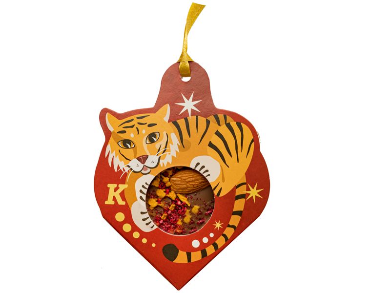 Символ наступающего года, в уже полюбившейся нам форме медианта. Молочный шоколад и зернышко миндаля, словно искорки фейерверка украшают кранч малины и манго.