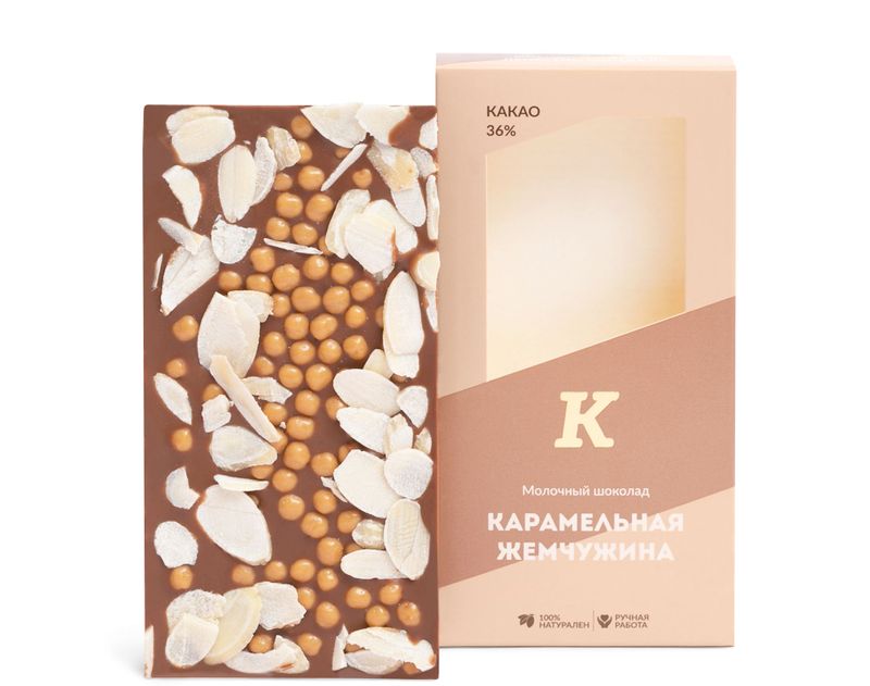 Состав: молочный шоколад (тростниковый сахар, какао-масло, какао тертое, сухое цельное молоко, эмульгатор: соевый лецитин; натуральный ароматизатор: ваниль), карамельные шарики (смесь молочного и белого шоколада с карамельным вкусом [сахар, какао-масло, карамельный порошок (молоко цельное сгущенное, сахар, сироп глюкозы, соль, регулятор кислотности: гидрокарбонат натрия), сухое цельное молоко, сухая молочная сыворотка (молоко); какао тертое, эмульгатор: соевый лецитин; натуральный ароматизатор: ваниль), соленые хлопья (пшеничная мука, сахар, соль, овсяная мука, пшеничная солодовая мука, разрыхлитель: гидрокарбонат натрия; натуральный ароматизатор: ваниль], глюкозный сироп, сахар, глянцеватель: гуммиарабик, модифицированный крахмал, растительный жир (кокосовый)), миндаль резаный. Содержание какао-продуктов — не менее 37%. Содержит молоко, сою. Может содержать следы продуктов, вызывающих аллергию.