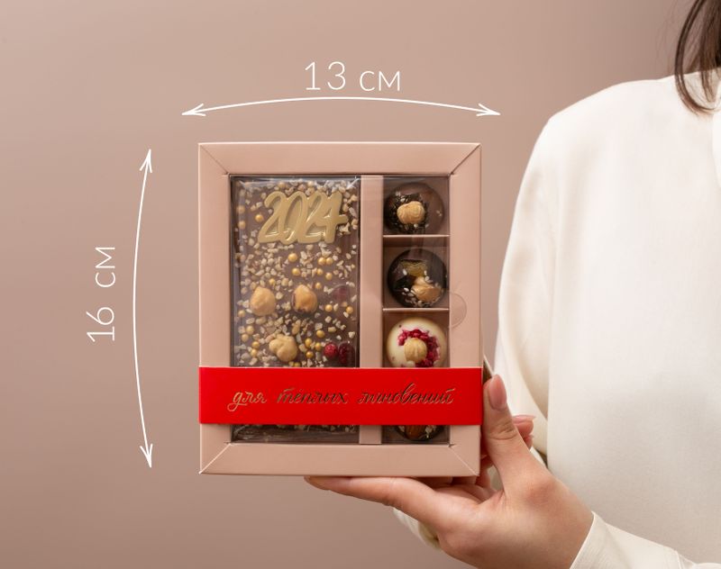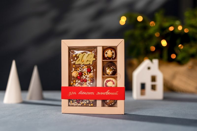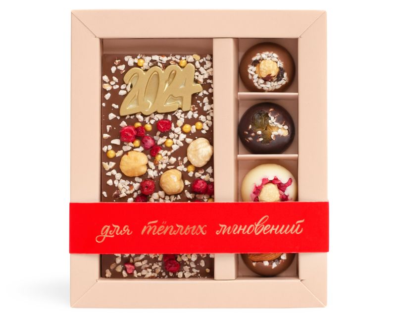 Аппетитный праздничный набор состоит из двух видов десертов — плитки шоколада и четырех конфет ручной работы.