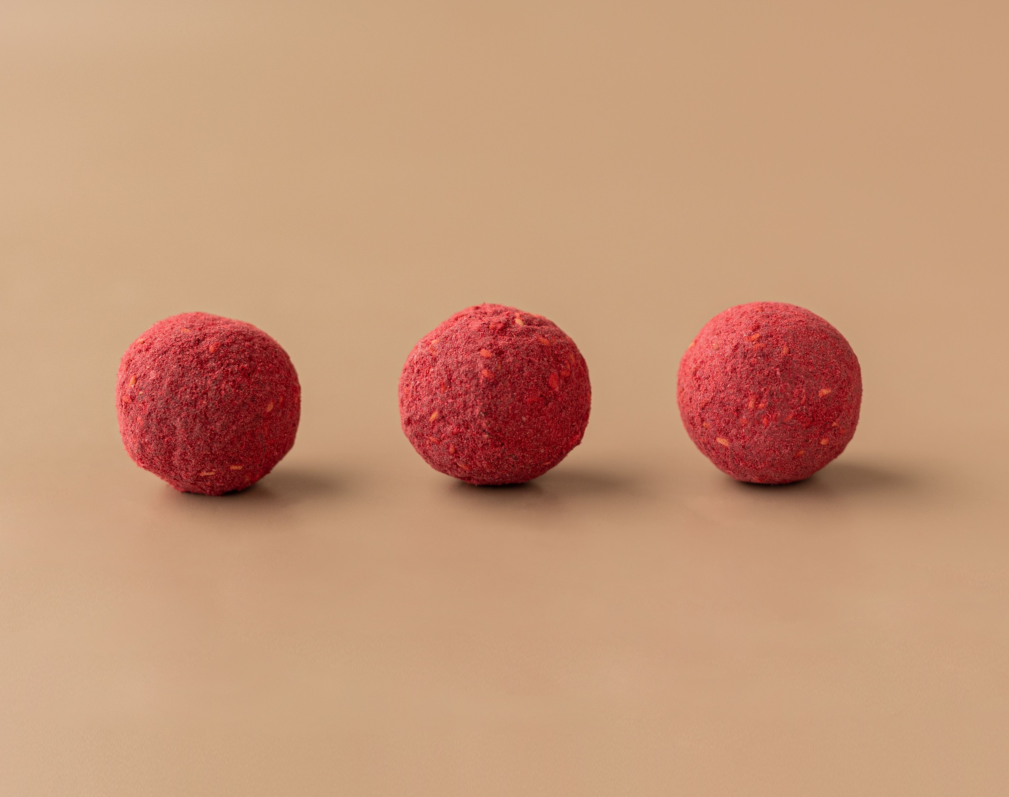 Трюфель в обсыпке из сублимированной малины полон задора и сюрпризов. Слегка кислый снаружи и сливочно-ягодный внутри.
