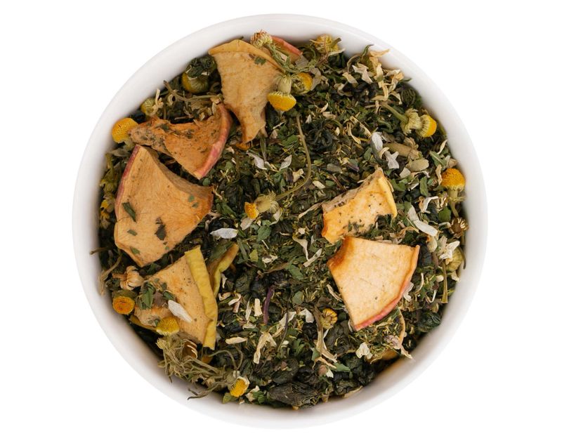 Состав: зеленый чай, ромашка, яблоко, мята.