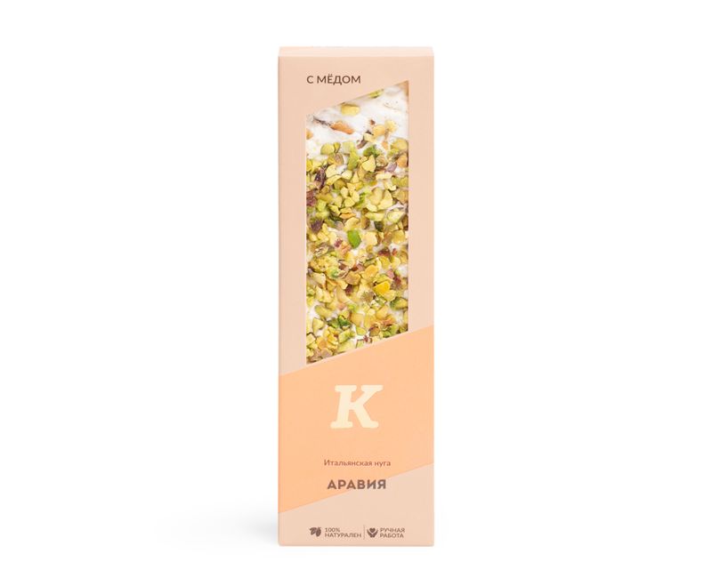 Состав: мед цветочный, сахар, сироп глюкозы, фисташки жареные, инжир сушеный, вода, сухой яичный белок, рисовые шарики (рис, сахар, соль), крахмал картофельный, вафельная бумага (картофельный крахмал, вода). Может содержать следы продуктов, вызывающих аллергию.