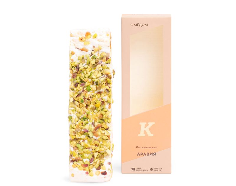 Аппетитная, плотная нуга с цельной фисташкой, инжиром и хрустящими рисовыми шариками. Сверху десерт посыпан дроблённой фисташкой.