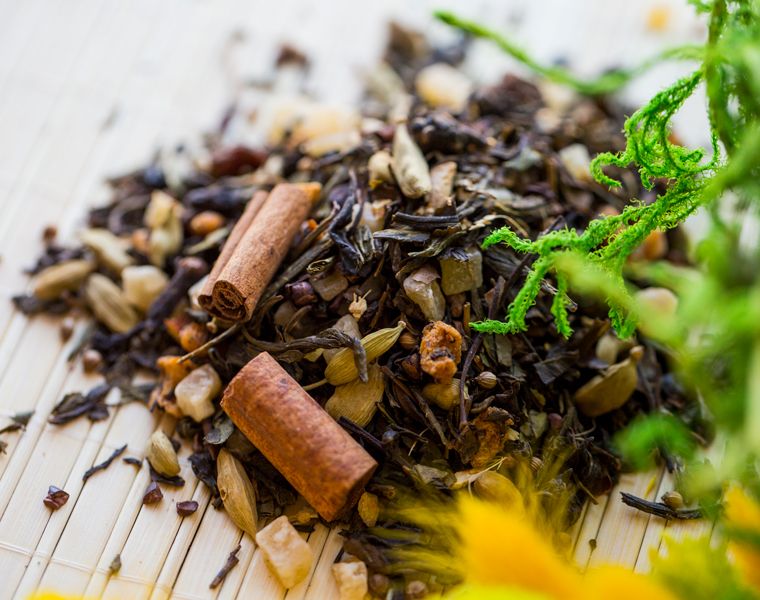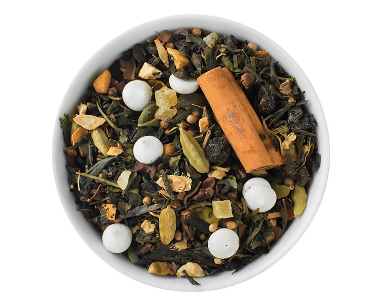 Состав: купаж белого чая и китайского зелёного чая Минг Ми, Сенча, ароматизатор, цукаты ананаса, изюм, цукаты папайи, кусочки какао, цукаты манго, палочки корицы, кориандр, кардамон, имбирь, гвоздика, жареный миндаль, сахарные безе, кусочки абрикоса, цедра апельсина и лимона.
