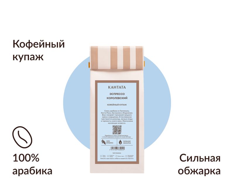 «Эспрессо Королевский» уже около 10 лет считается лучшим эспрессо в ассортименте Кантаты. Его вкус покоряет аристократичной горчинкой грецкого ореха и марципана, а послевкусие напоминает шоколад с лесными ягодами и терпкость сухого вина.