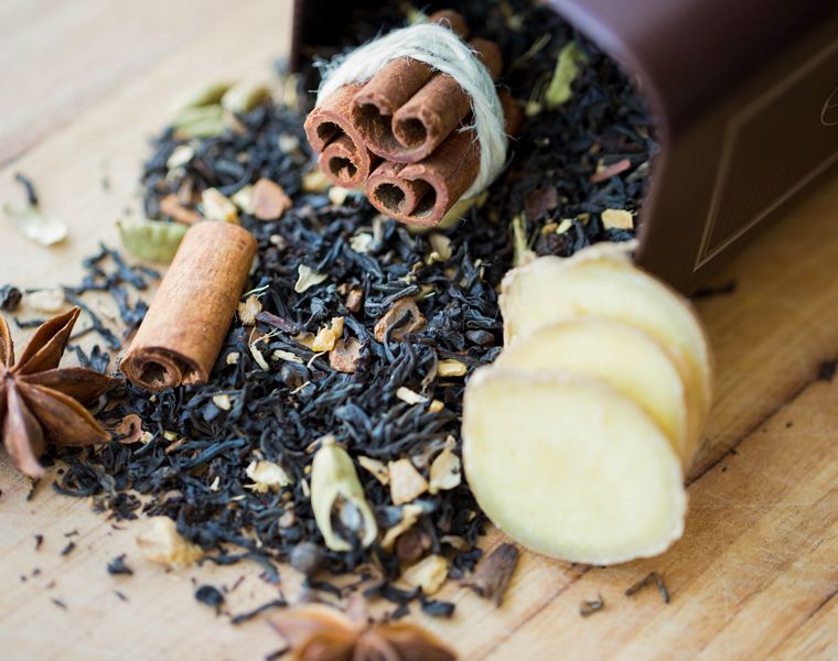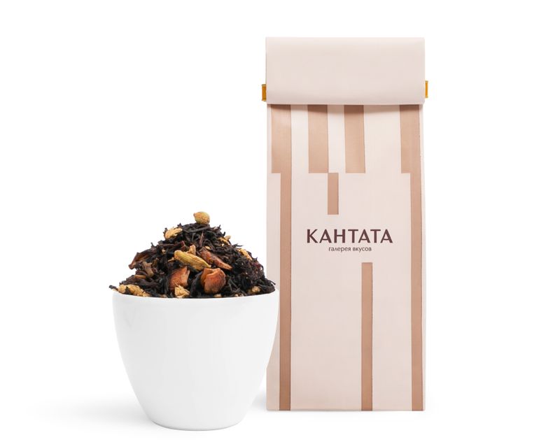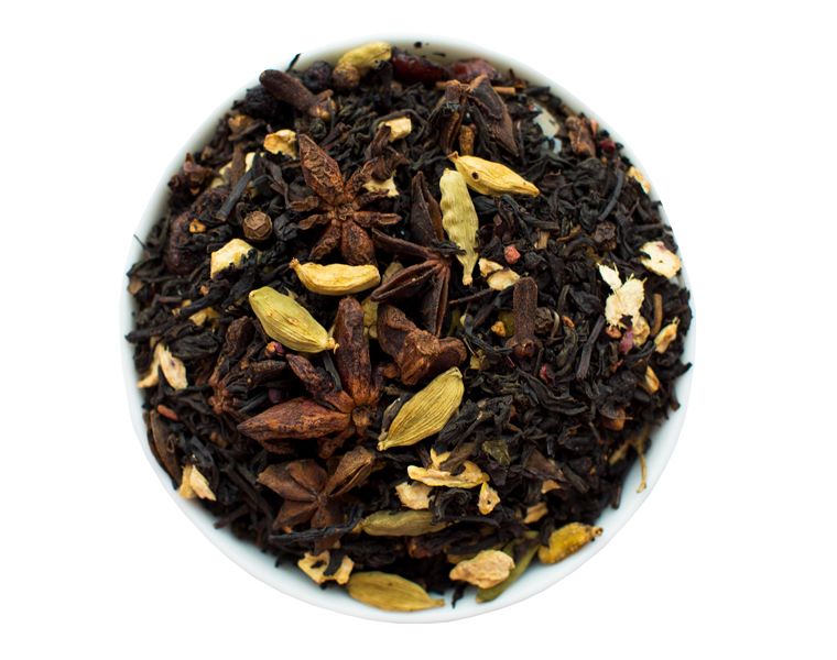 Состав: чёрный чай, кусочки имбиря, клюква, ароматизатор, анис звёздчатый, кардамон, гвоздика, черный перец, черника.