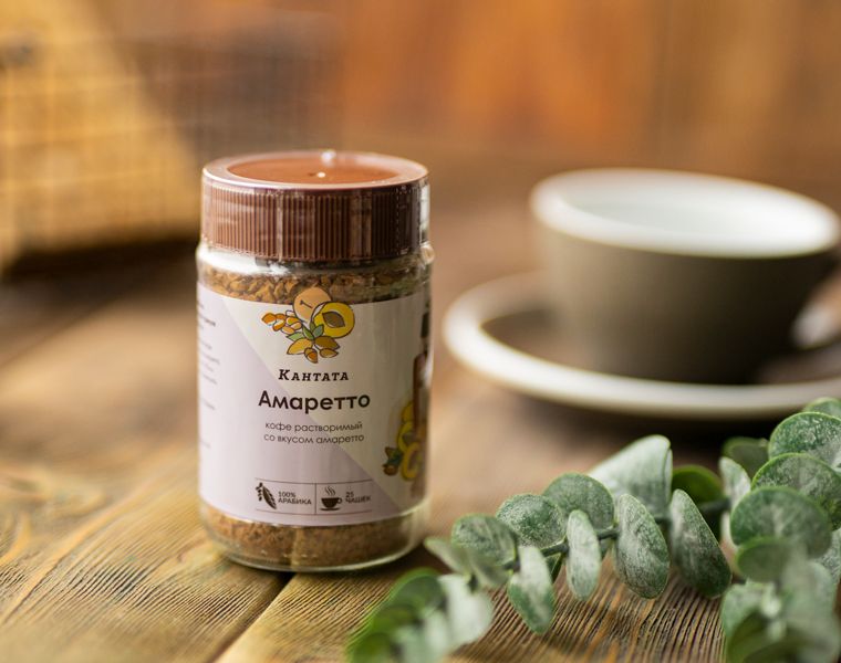 Растворимый кофе с ярким ароматом миндального ликёра, сладостью ванили, послевкусием абрикосовых косточек и специй.