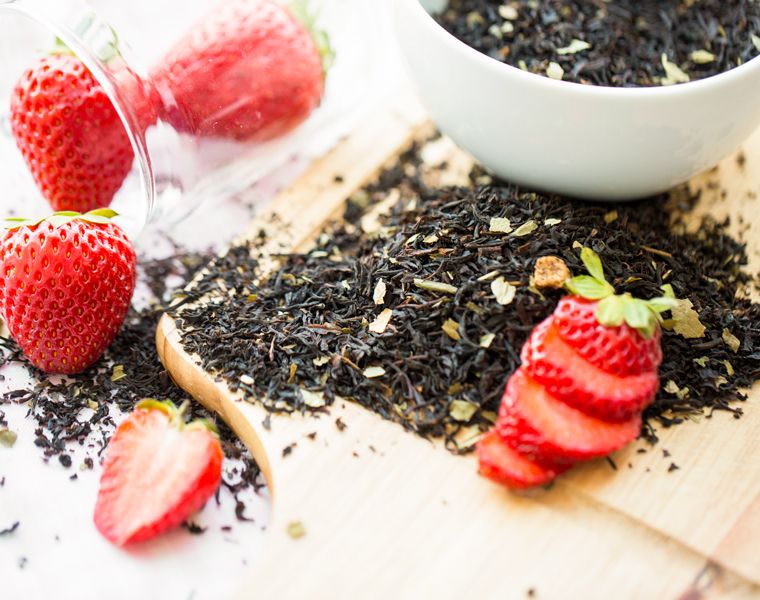 Состав: чёрный чай, ароматизатор, листья земляники, кусочки клубники.