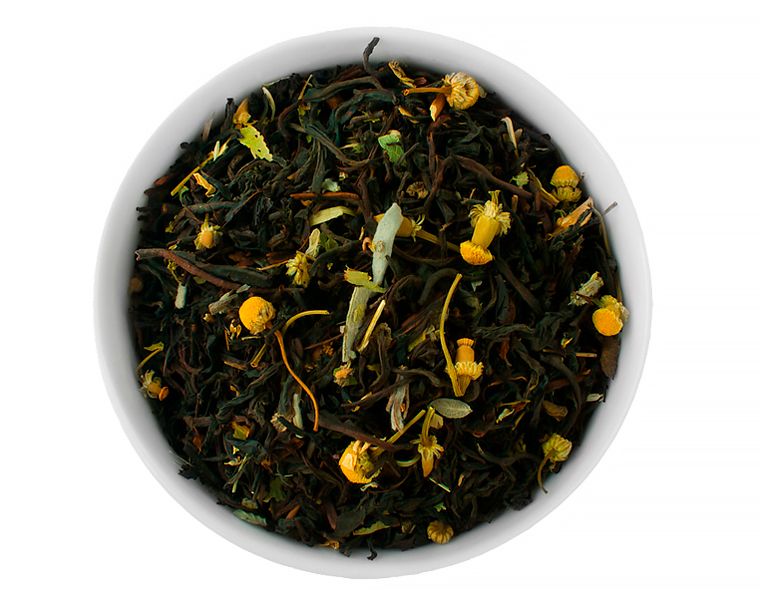 Состав: купаж чёрного и зелёного чая, чабрец, зверобой, цветы липы, листья перечной мяты, ромашка, листья шалфея.