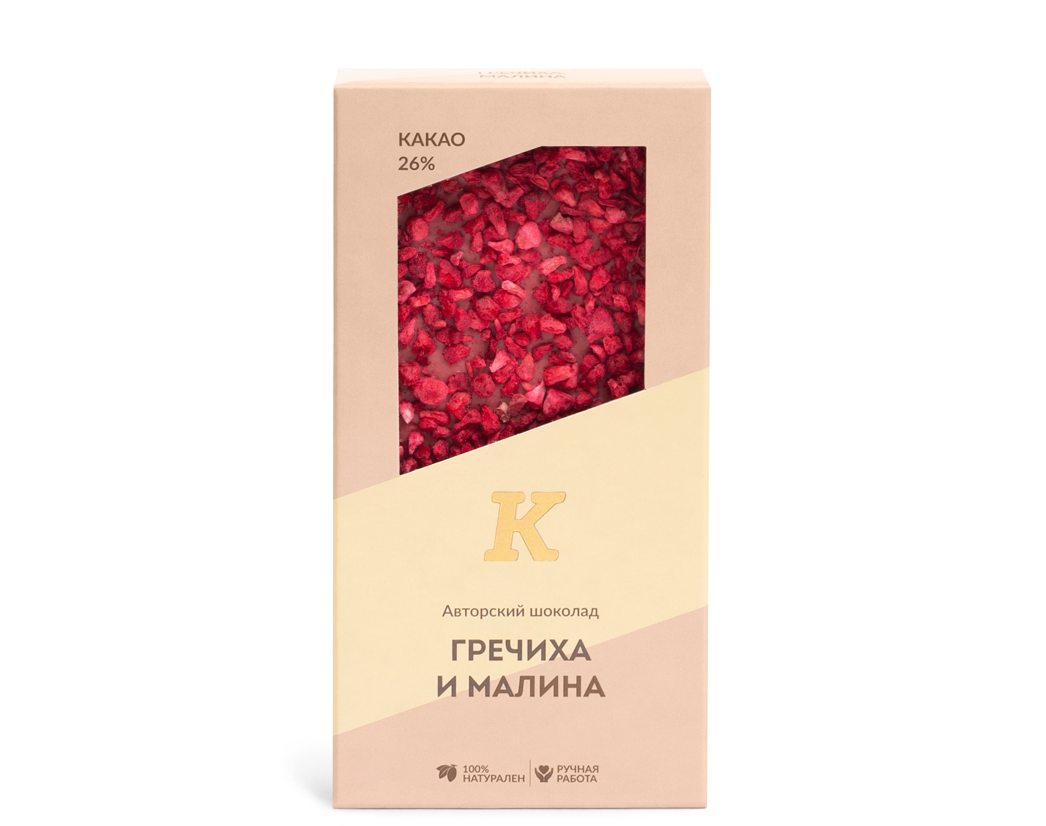 Авторский гречишный шоколад с малиной создан по уникальному рецепту, в котором сплелись гречишный чай, сублимированная малина и нежнейший бельгийский белый шоколад. Вкус напоминает воздушный десерт на йогуртовой основе. Каждый кусочек все глубже погружает в «пену рассветных облаков», но не дает утонуть в ней, благодаря деликатной, приглушенной бархатистости гречишного чая.