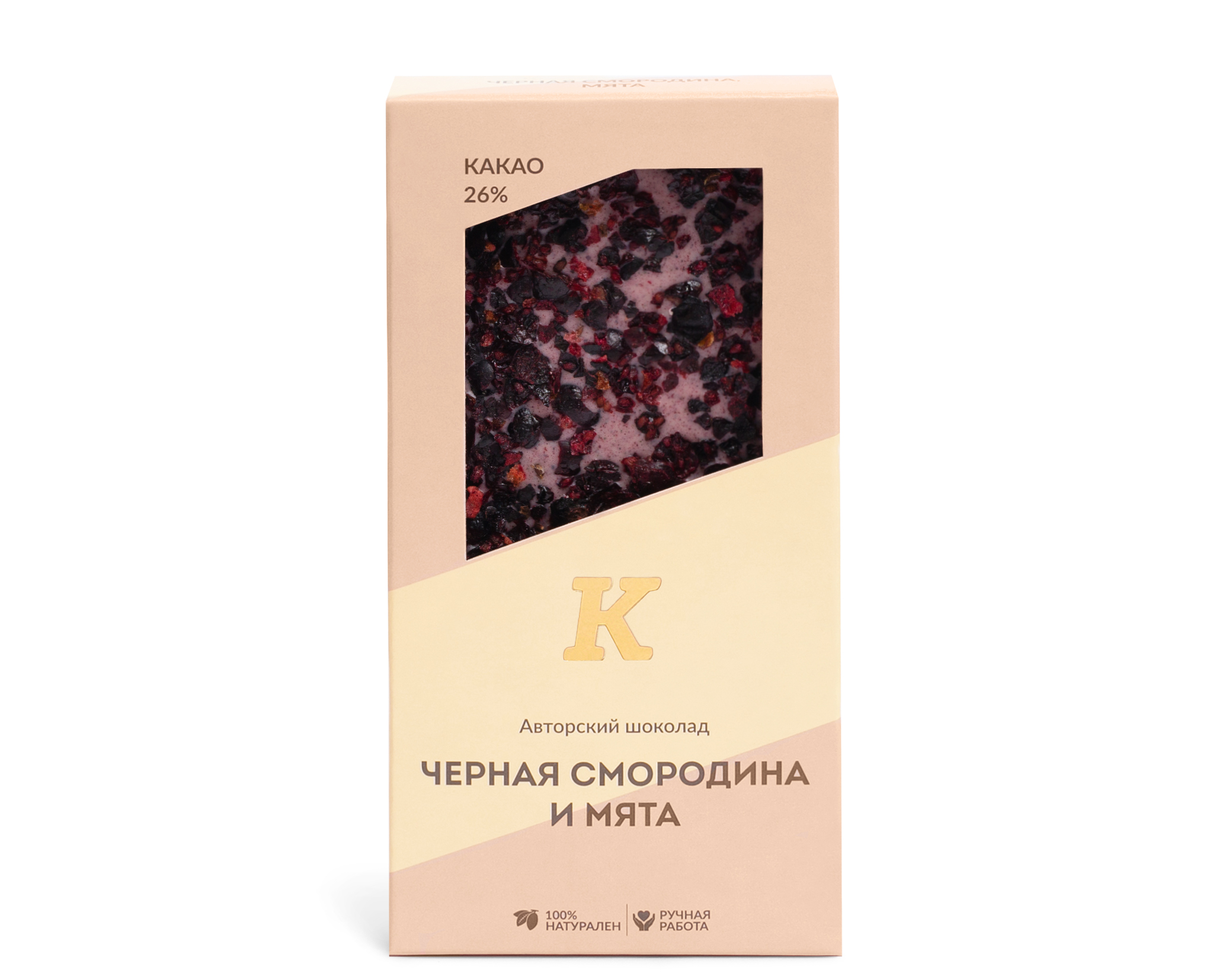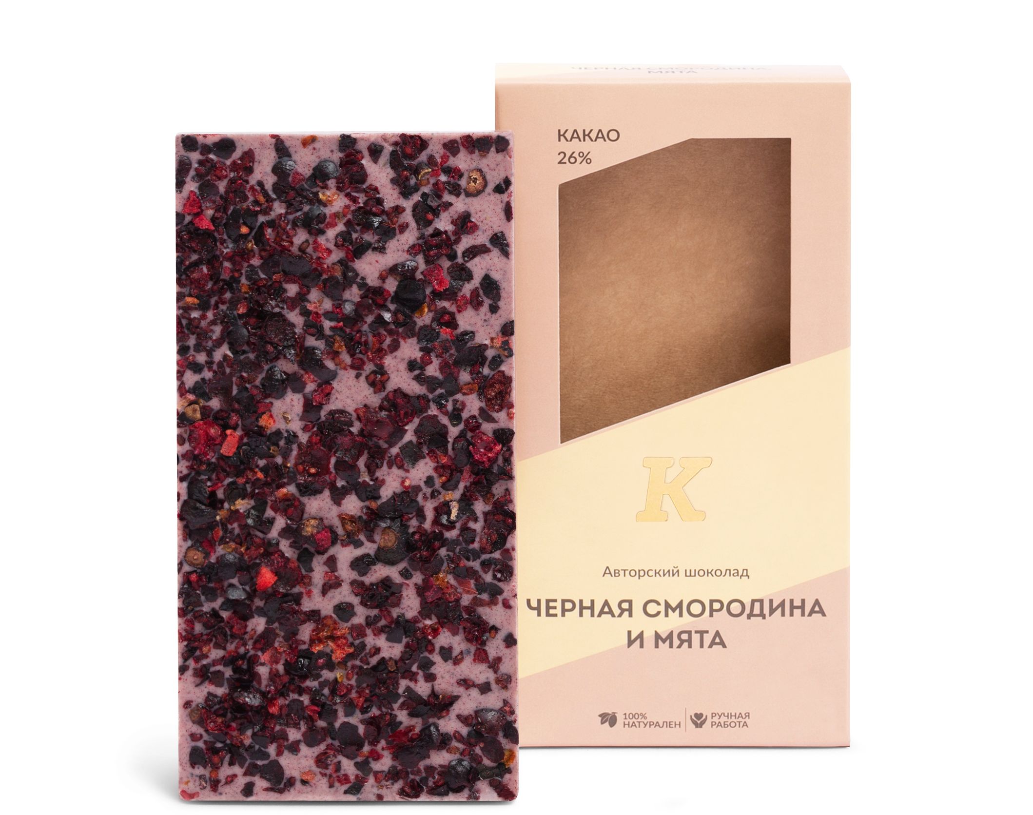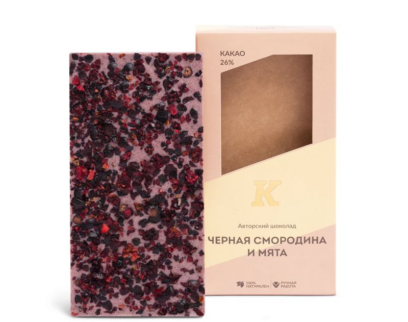 Плитка авторского шоколада напоминает освежающий ягодный сорбет. Собирает в себе всю яркость вкусов игривой и пленительной черной смородины и холодной, чуть доминирующей, мяты.