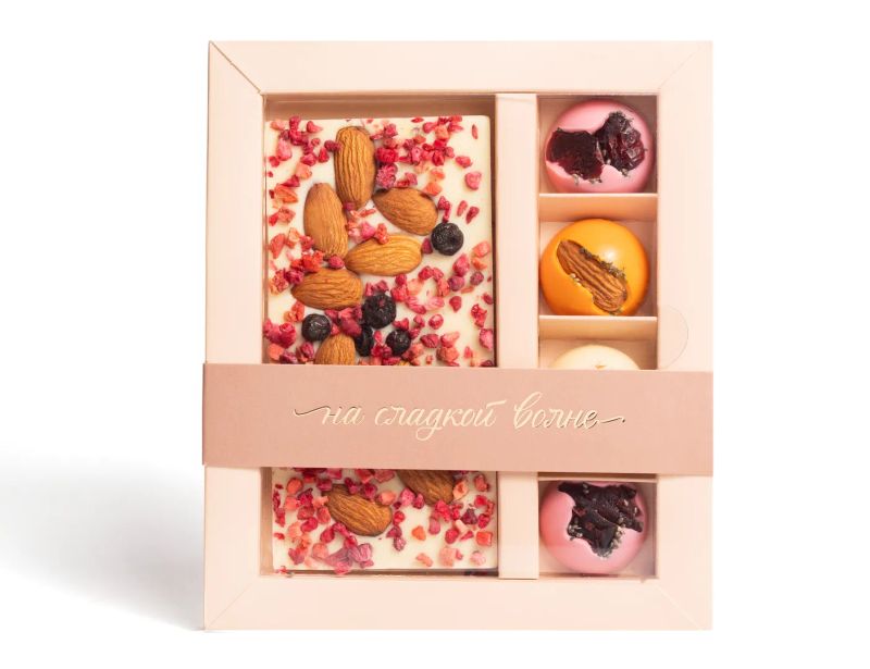 В наборе вы найдете шоколадную плитку «Миндально-ягодный коктейль» из белого шоколада с добавление миндаля и ягод, а также четыре уникальных по вкусу шоколадные «полусферы»: