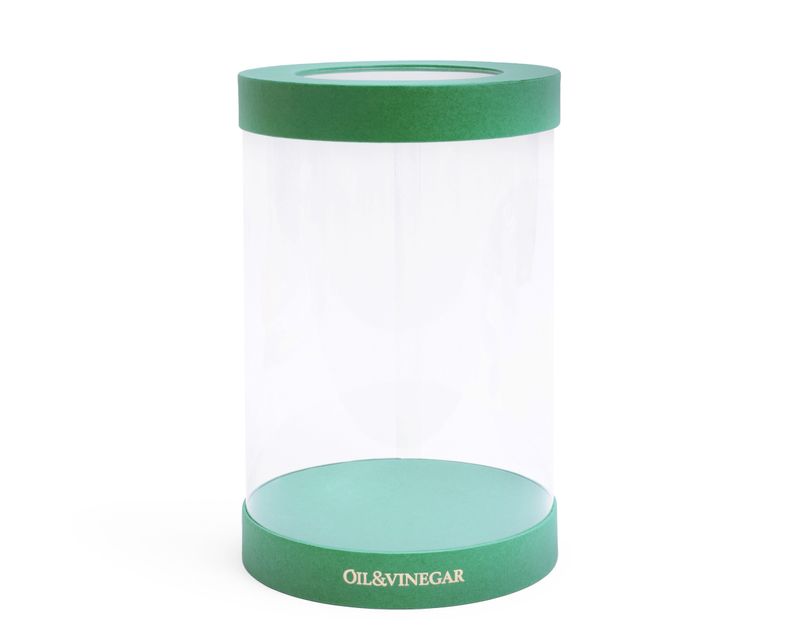 Эта эффектная шляпная коробка имеет упругие прозрачные стенки. В ней любой подарок — чай, кофе, десерты или ингредиенты Oil&Vinegar — будет смотреться презентабельно и стильно. Размер коробки — 18*27,5см.