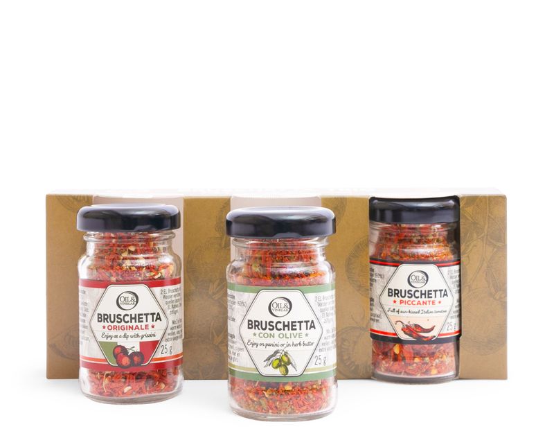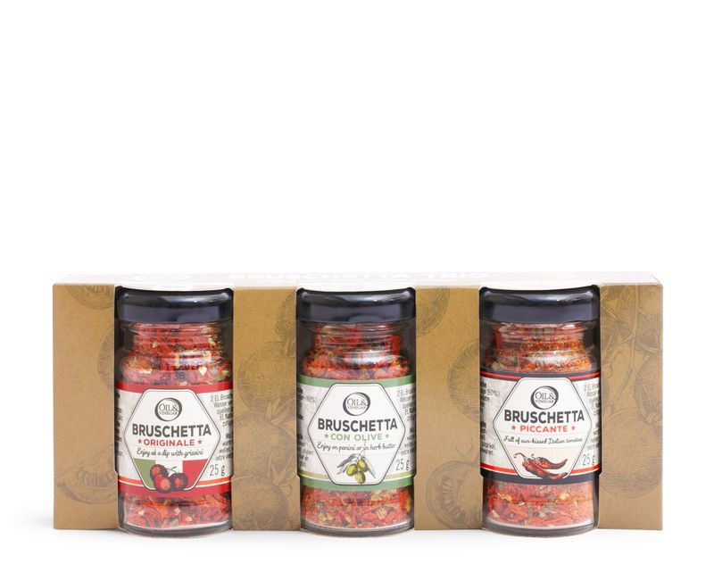 Перед вами три вида ароматных брускетт — универсальных специй на основе отборных томатов. В нашем наборе — три вкуса: оригинальный, пикантный и с оливками. Каждая из брускетт дополнит вкус блюд и приятно удивит даже самого искушённого гурмана.